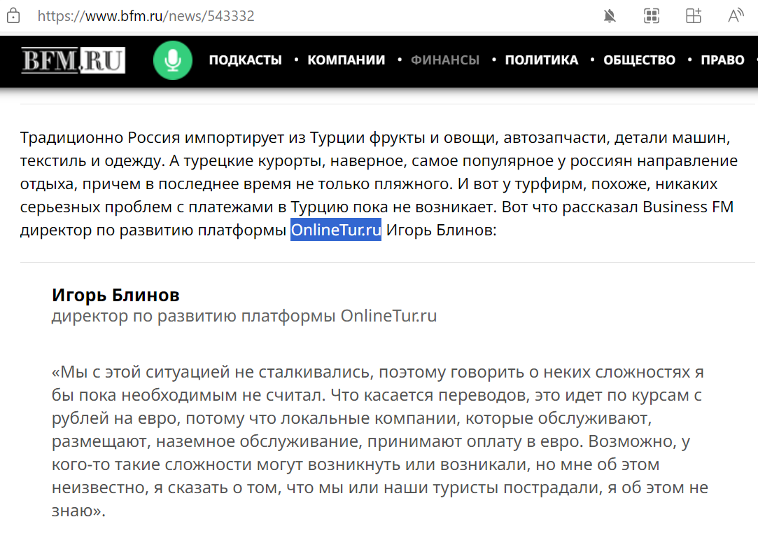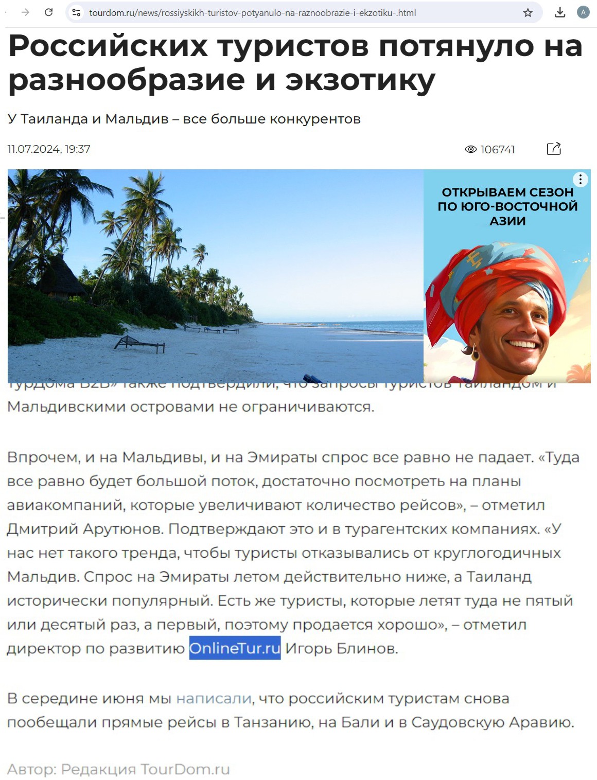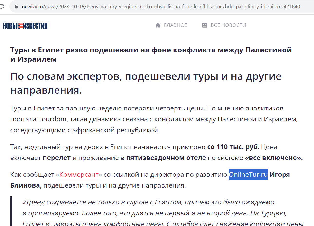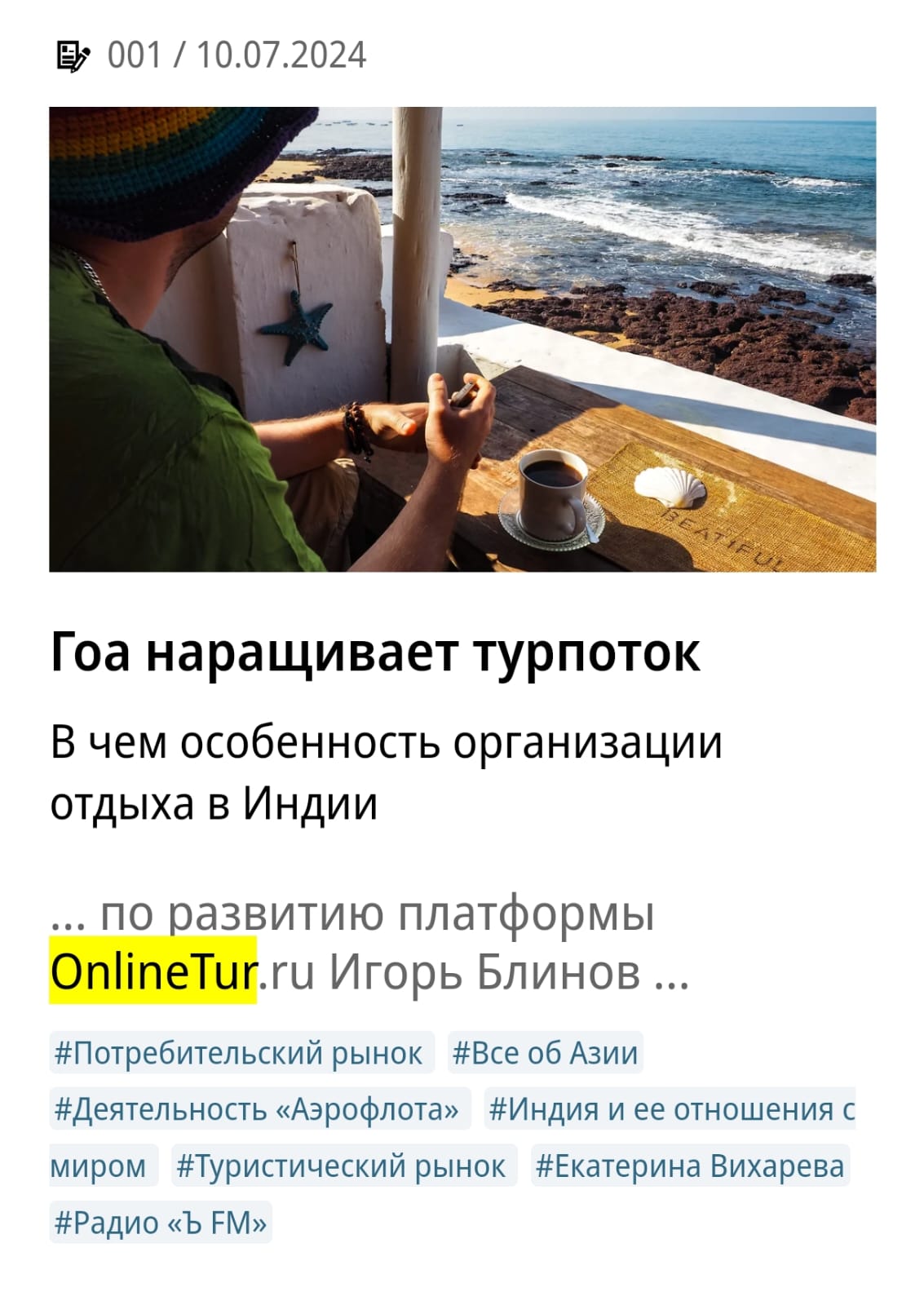 Цитируемость OnlineTur.ru в СМИ за 10 лет с 2014 по 2025 год: Коммерсант, РБК, Россия 24, Бизнес ФМ, Вести 24, Россия 1, Ведомости, Известия, Forbes, ПРАЙМ, НТВ, Рен ТВ, Москва FM, Радио России, Вечерняя Москва, News-Life, РИА Новости, Sputnik, Lenta.Ru, Business FM, Общественное телевидение России, Телеканал 360, Московский Комсомолец, Live24.ru, RT, Москва 24, Комсомольская правда, РБК ТВ, Вести ФМ, ТАСС, Российская газета, Газета.Ru, Национальная служба новостей и другие.