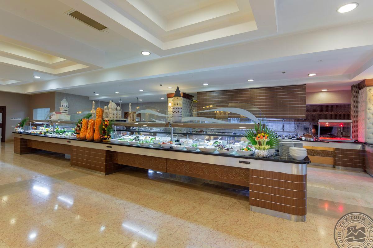 Территория:> рестораны: 2 (основные, есть диетический стол) бары: 6 крытые бассейны: 1 бассейны: 1 (открытый) спа-центр (платно) конференц-залы: 1 (200-320 чел.) у бассейна полотенца: бесплатно у бассейна зонтики, шезлонги: бесплатно рестораны a la carte: 3 (турецкая кухня, морепродукты, кубинская кухня; по резервации, 1 раз в неделю) кондитерская врач по вызову (платно) Wi-Fi бесплатно прачечная платно парикмахерская (платно) магазины