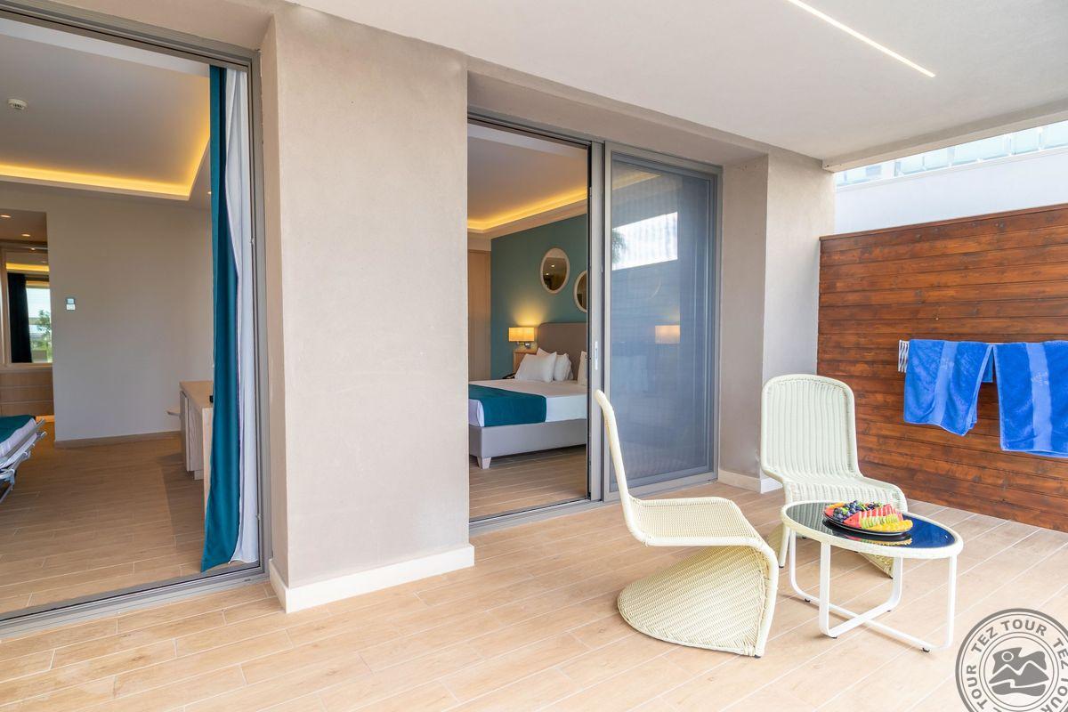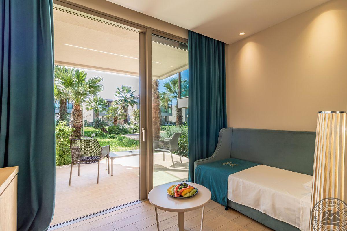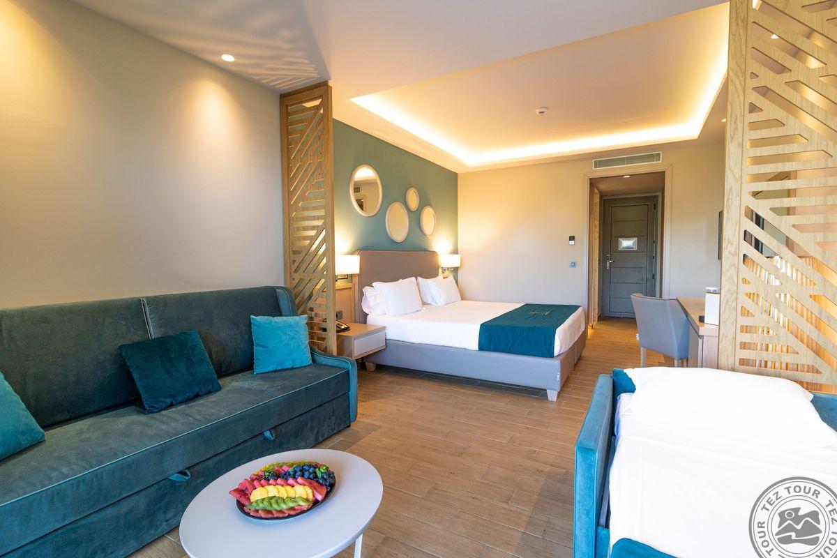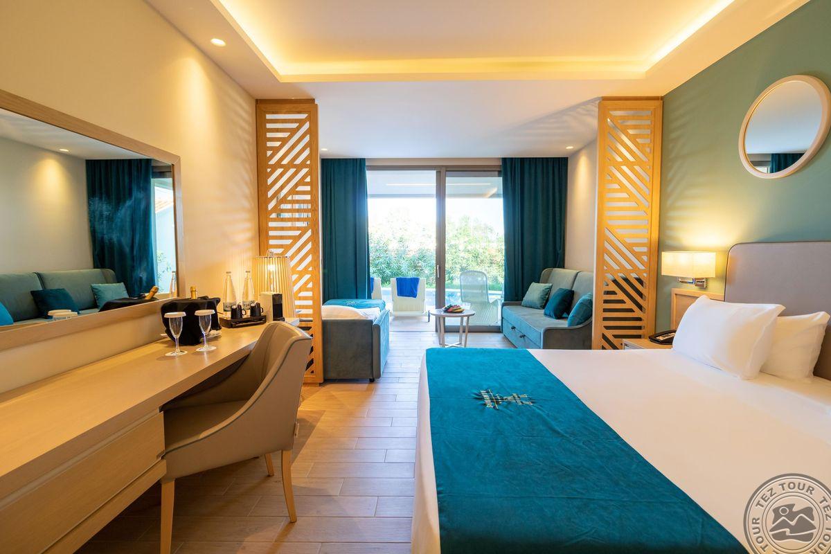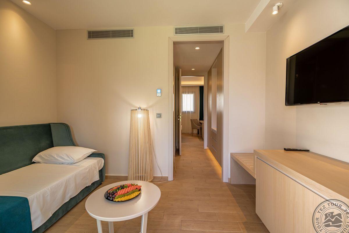 - Расположение: в 38 км от аэропорта и г. Корфу, на берегу моря. Автобусная остановка находится в 1,2 км от отеля. Вечерние развлечения за пределами отеля: Ахарави (3 км от отеля). Отель: Меры предосторожности (Covid-19) ______ Входит в сеть отелей V-Hotels Group Отель полностью перестроен в зимний период 2018-2019 годов. Состоит из главного здания и комплекса 12 бунгало. Всего 180 номеров: Deluxe (осн. кровать – двуспальная, доп.- раскладное кресло- кровать (0,90х1,90), макс. 2+1 чел.+инфант, 28 м2); Family room (спальня и гостиная разделенные дверью, осн. кровать – двуспальная, доп. – софа (1,40х1,90)