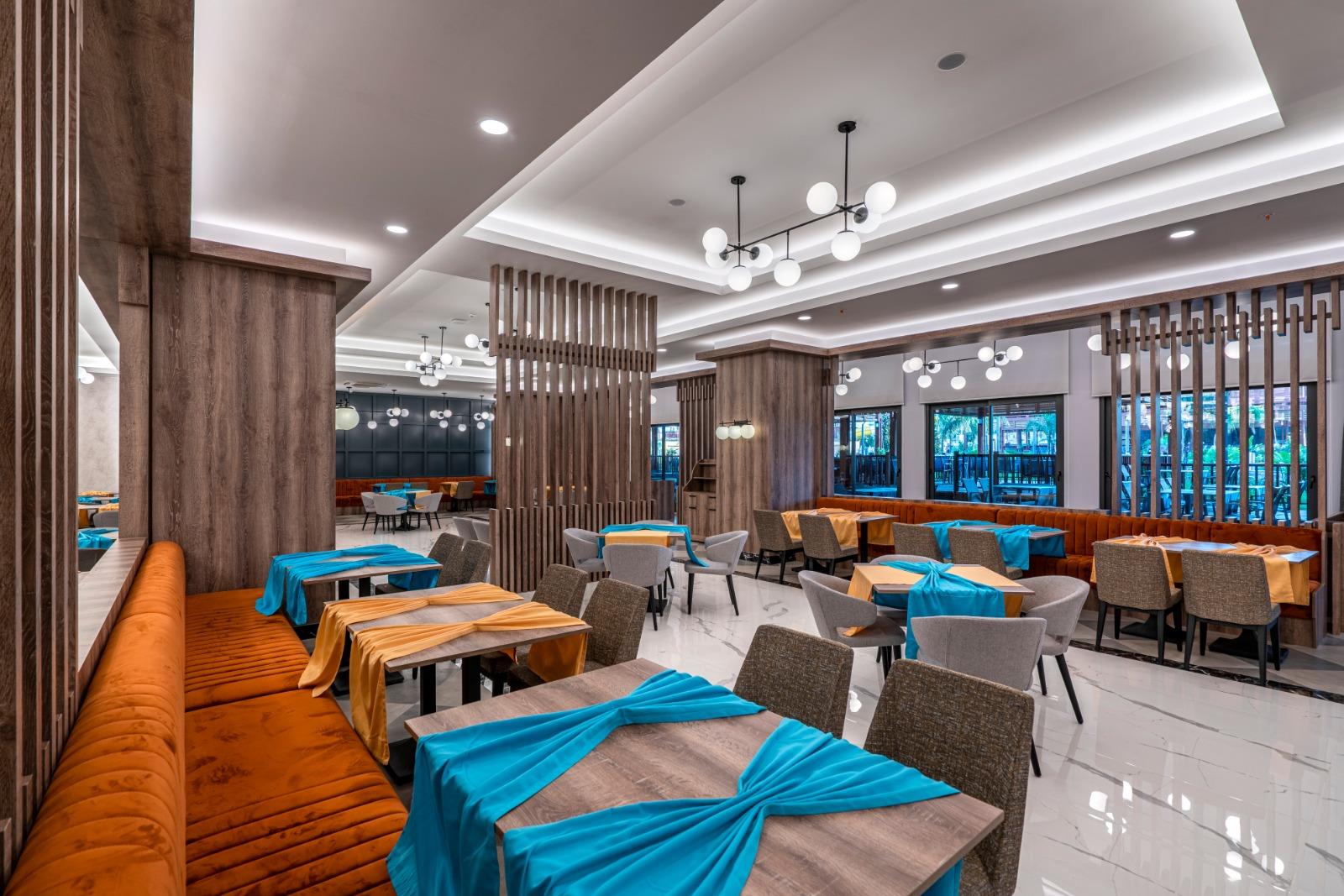 Рестораны, кафе и бары:- главный ресторан (1200 кв.м, на 600 чел.)- ресторан а ля карт (турецкая кухня, на 40 чел., 19:00-21:00)- ресторан а ля карт (итальянская кухня, на 40 чел., 19:00-21:00)- ресторан а ля карт (рыбный, на 40 чел., 19:00-21:00)- снэк-ресторан (на 150 кв.м)- кондитерская (100 кв.м, на 60 чел.)- лобби-бар (24 часа)- бар на пляже (10:00-18:00)- бар у бассейна (10:00-00:00)- диско-бар (23:00-02:00)- кофехаус (10:00-00:00)*посещение одного ресторана а ля карт 1 раз за все время пребывания (не менее 7 ночей) - бесплатно и по предварительной резервации.