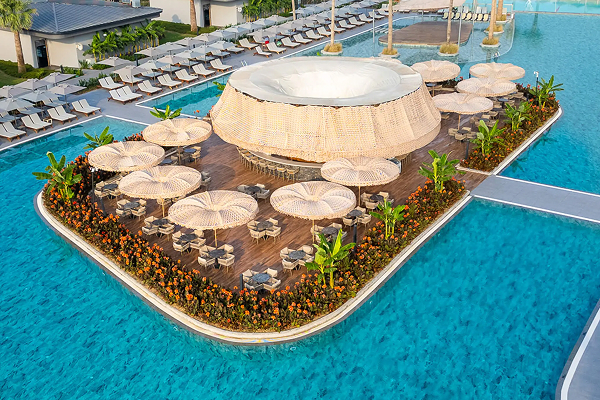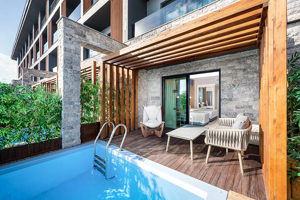 Swimup Rooms (40-43 м², макс. 3 взрослых + 1 ребенок, балкон) — вид на территорию/море.