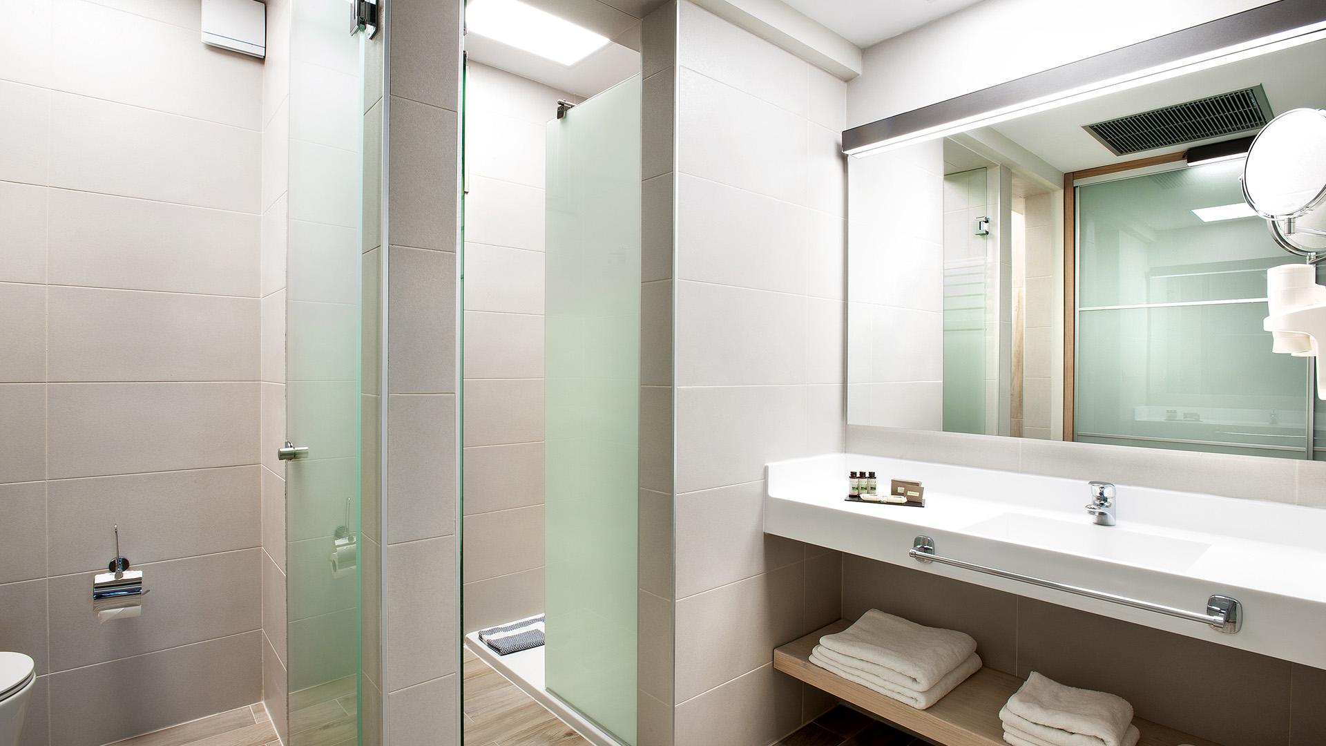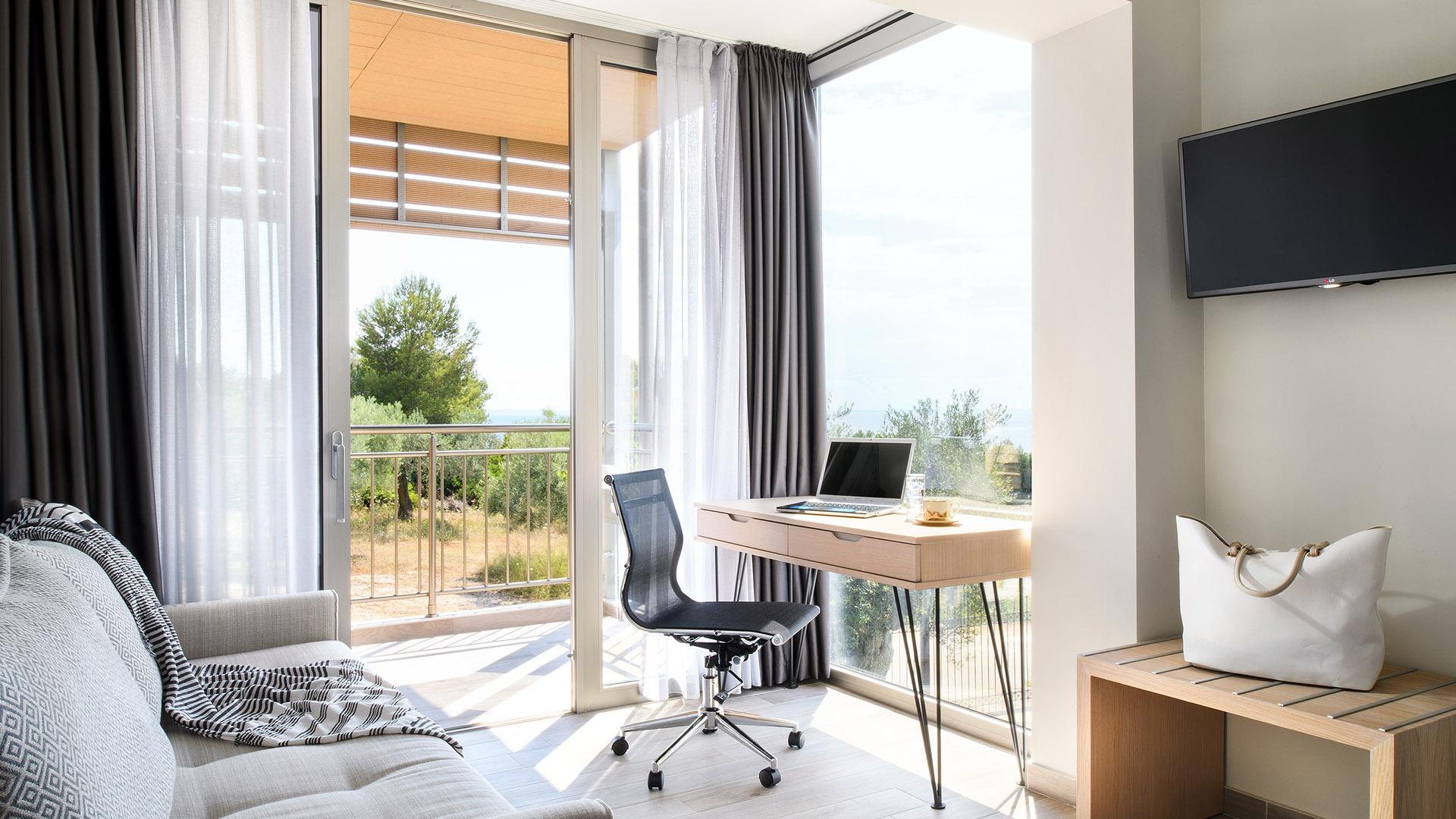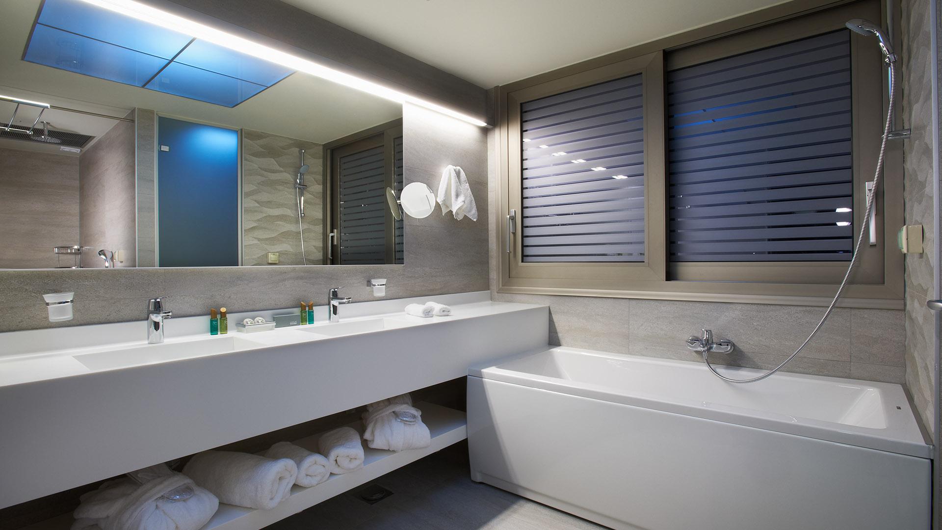 - Suite Sea View – 50 кв.м (макс. 3): номер открытой планировки с кроватью king-size и двуспальной диваном-кроватью, кофемашина эспрессо, ванная комната с ванной и душевой, уборная, оборудованный балкон или терраса