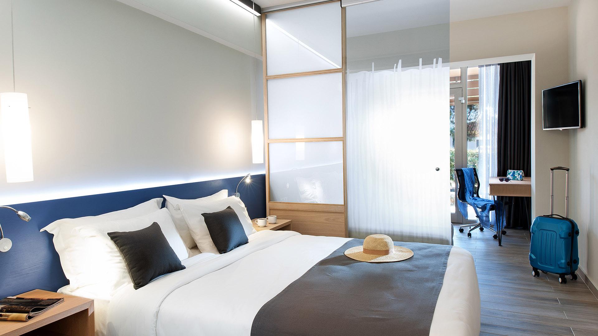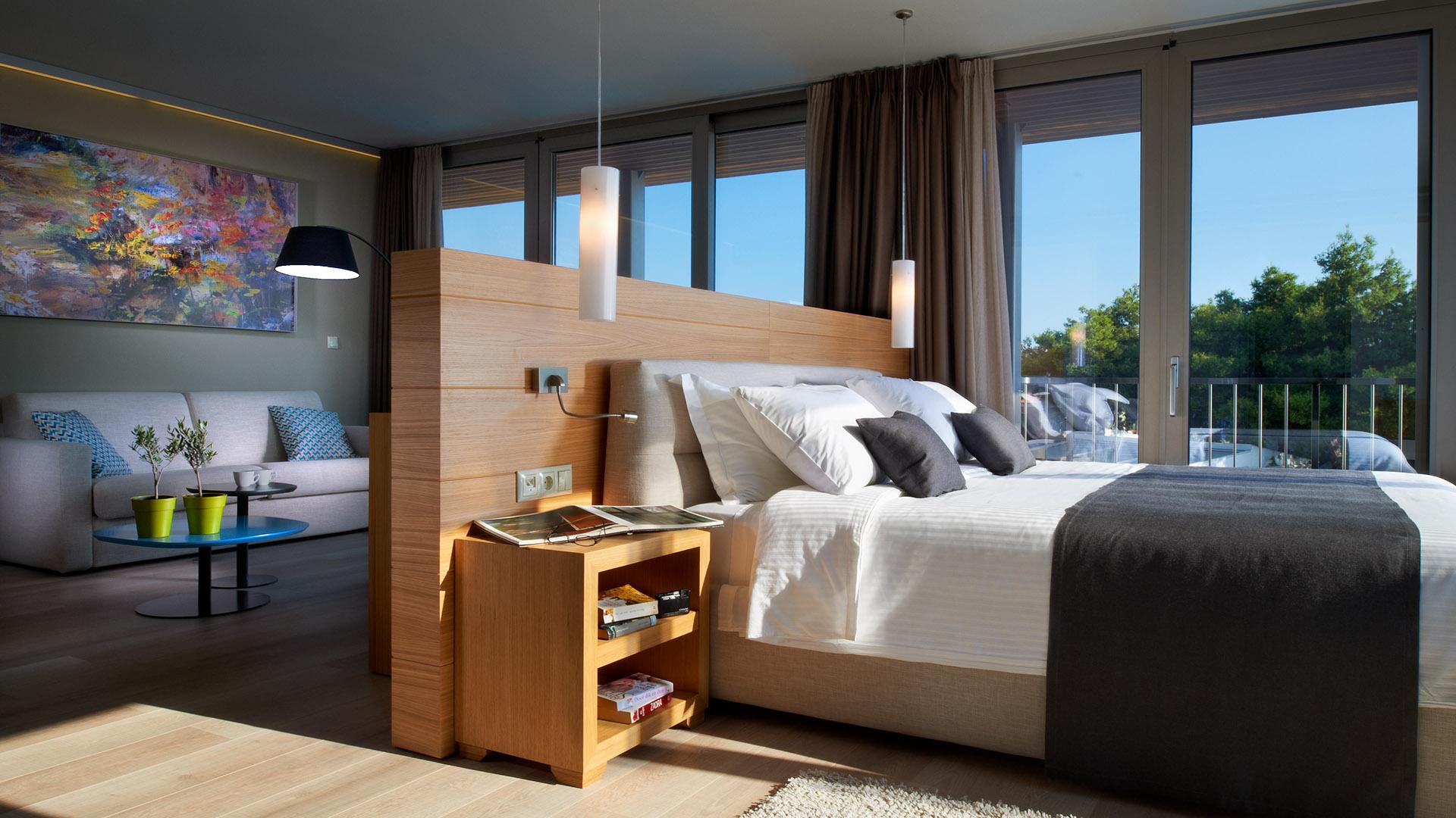 - Deluxe Family Suite – 55 кв.м (макс. 3+1): спальная комната с двуспальной кроватью, отделенная дверью гостиная комната с 2 диванами-кроватями, кофемашина эспрессо, ванная комната с ванной и душевой, уборная, оборудованный балкон или терраса