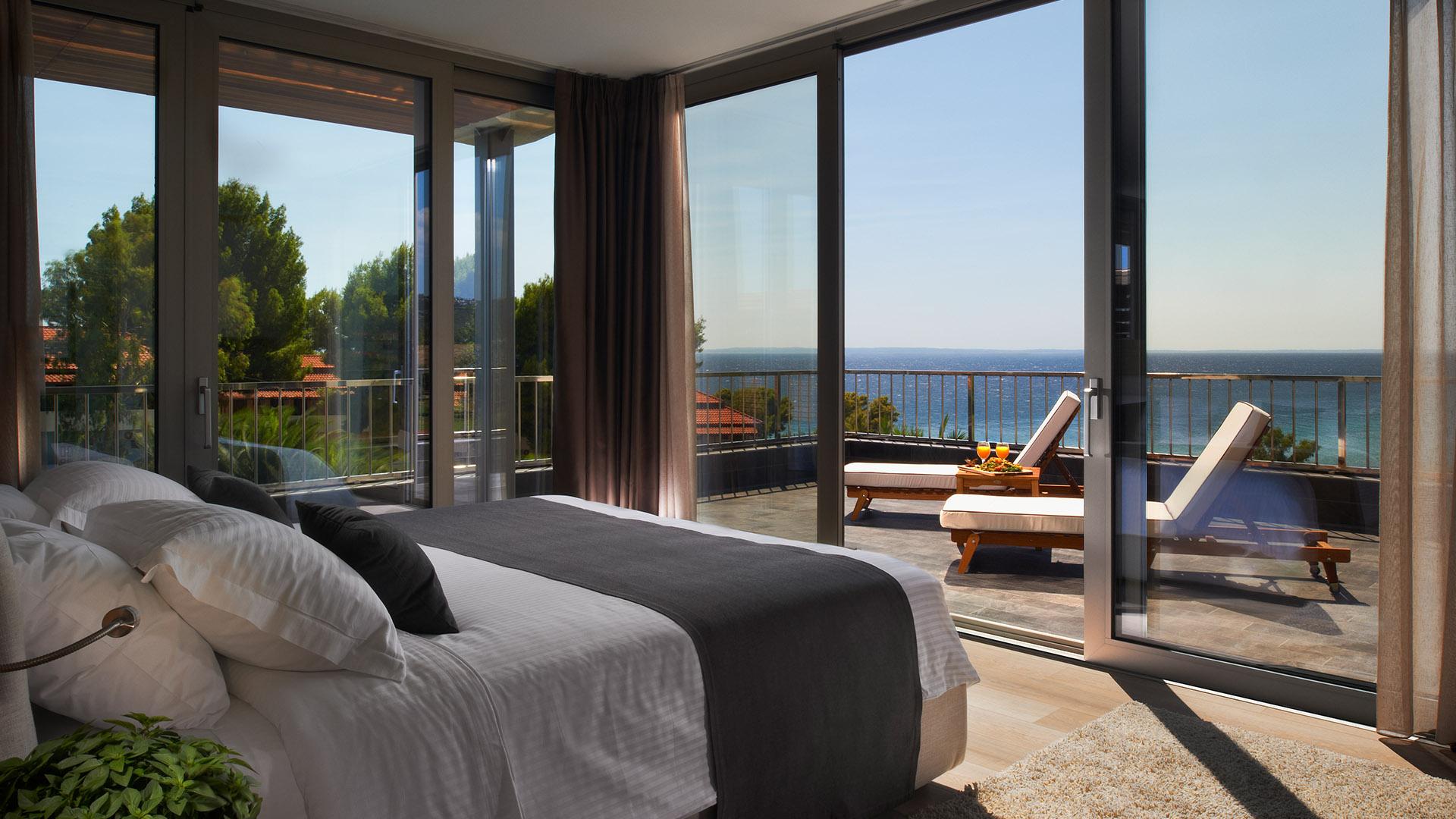 - Deluxe Suite Sea View – 60 кв.м (макс. 3): номер открытой планировки с кроватью king-size и двуспальной диваном-кроватью, ванная комната с ванной и душевой, уборная, оборудованный балкон или терраса