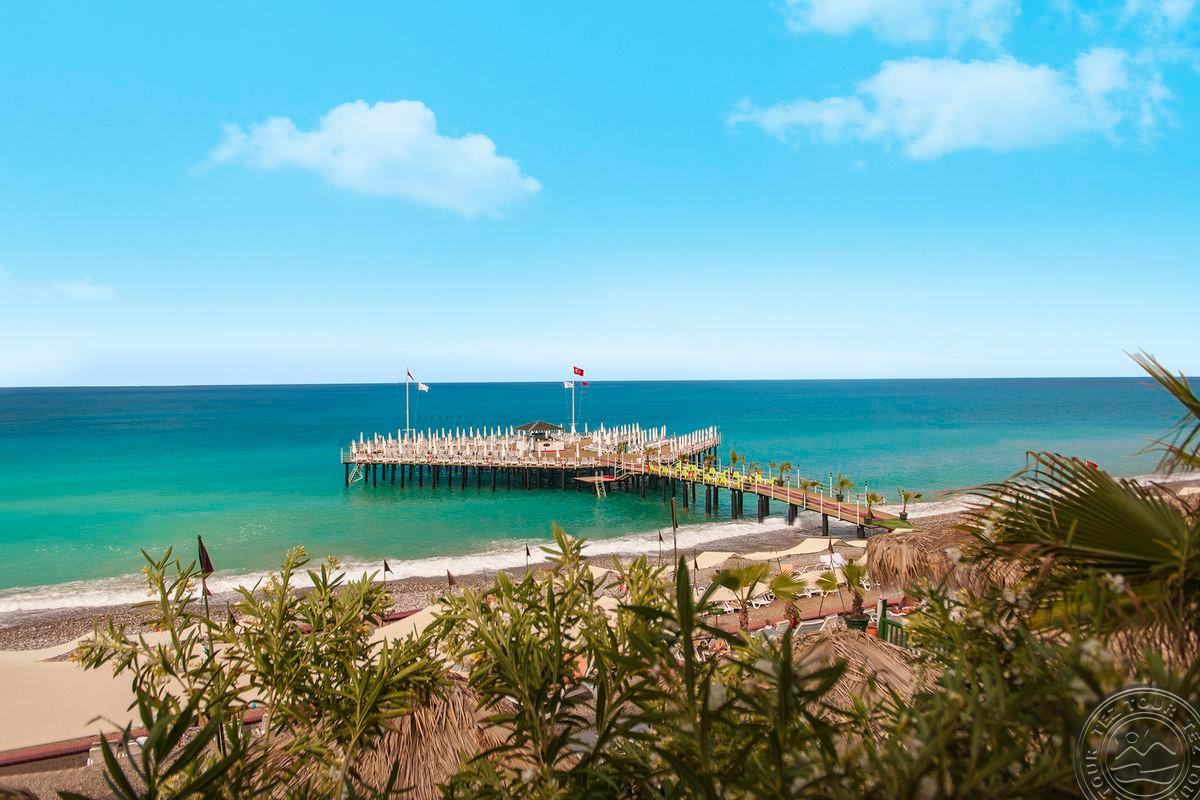 в 90 км от аэропорта г. Анталья, в 32 км от г. Аланья, в поселке Окурджалар, на берегу моря.