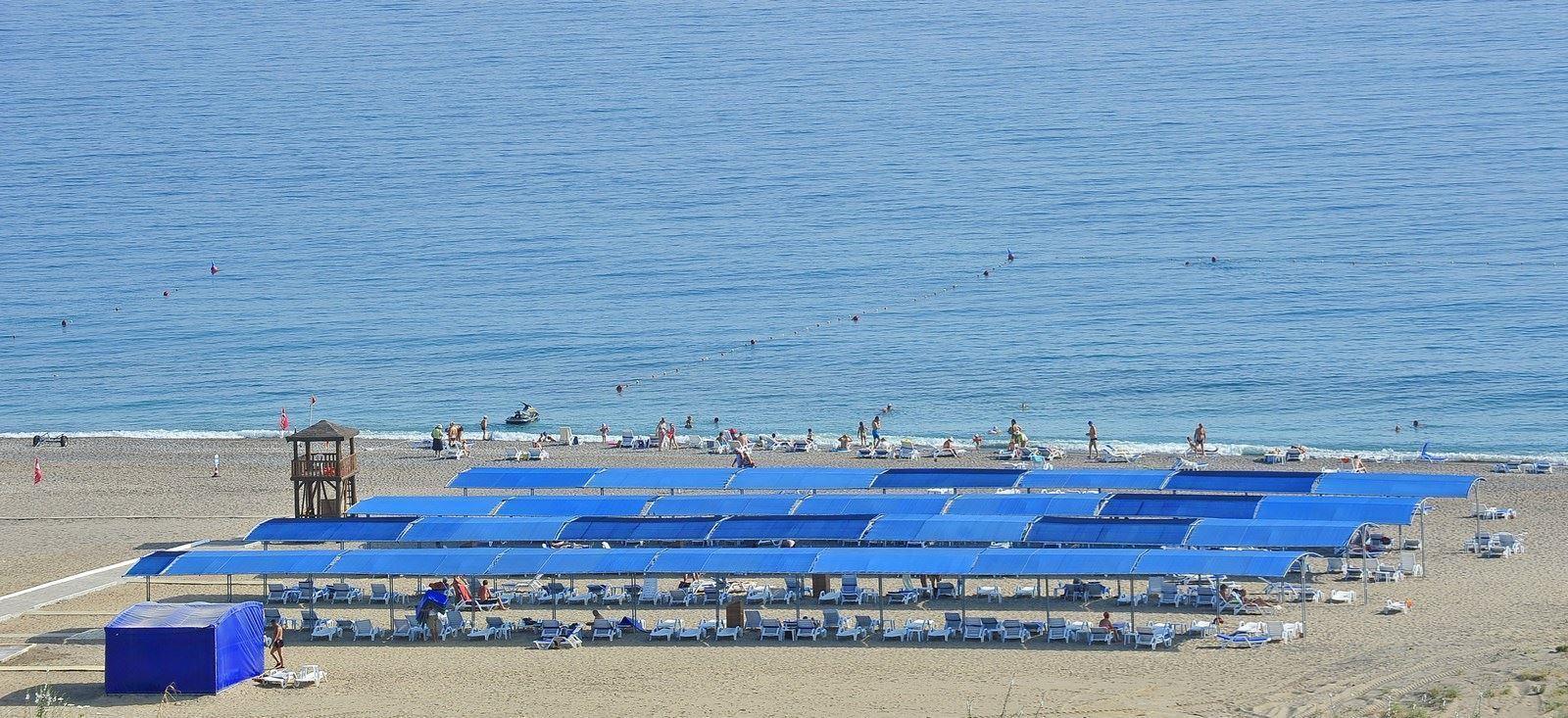 Шезлонги, зонтики, пляжные полотенца (по карточке) - бесплатно.