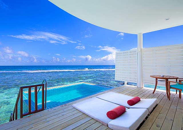 - (20)Club Sunset Overwater Villa with Pool (ex.Premium Deluxe Sunset Overwater Villa with Pool) (Общая площадь 114 кв.м. Площадь виллы 79 кв.м) Водные виллы с бассейном, расположены на сваях над водой в западной части острова. К услугам гостей спальня с зоной отдыха и кроватью king с балдахином, ванная комната с душевой кабиной и ванной, меблированная терраса для отдыха с персональным бассейном (12 кв.м.) и спуском в океан.
