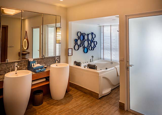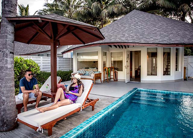 - (08) Club Two Bedroom Beach Pool Villa (ex.Two Bedroom Beach Villa with Private Pool) ( Общая площадь 159 кв.м. Площадь виллы 114 кв.м.) Двухуровневые пляжные виллы с двумя спальнями и бассейном. На верхнем уровне расположена спальня с кроватью king и ванная комната с душевой кабиной. На нижнем уровне находятся гостиная, вторая спальня с кроватями twin, ванная комната с душевой кабиной и душем на открытом воздухе, меблированная терраса с персональным бассейном (22 кв.м.) и выходом на пляж.