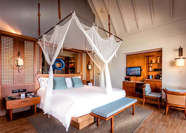 - (10)Family Overwater Villa with Kids Bedroom (ex. Family Overwater Villa) (Общая площадь 93 кв.м. Площадь виллы 59 кв.м.) Семейные водные виллы с детской спальней, расположены на сваях над водой. К услугам гостей главная спальня с зоной отдыха и кроватью king, небольшая детская спальня с двухъярусной кроватью, ванная комната с душевой кабиной и джакузи, меблированная терраса для отдыха со спуском в океан. Терраса имеет ограждение по всему периметру, а спуск в воду оснащен калиткой с замком для дополнительной безопасности юных гостей.