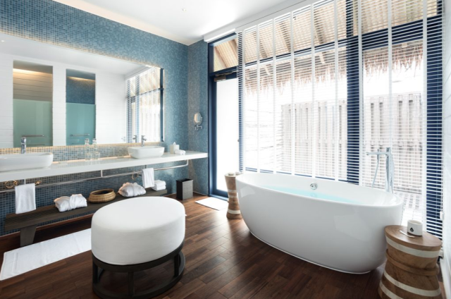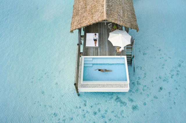4 One Bedroom Villa with Pool (125 м2) Вилла над водой, спальня находится на невысоком подиуме со стеклянными вставками, а просторная гостиная - на пару ступенек ниже. К огромной ванной комнате примыкает терраса с душем на открытом воздухе, имеется гостевой туалет. Из гостиной с тремя стеклянными стенами осуществляется выход на приватную террасу для принятия солнечных ванн с прямым спуском в лагуну. Максимальное размещение: 2 взрослых и ребенок (схема номера)