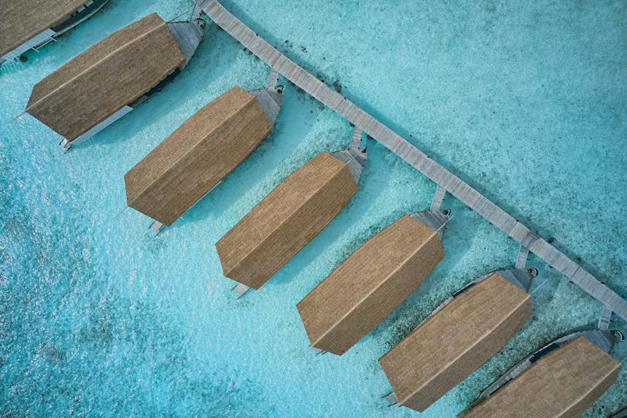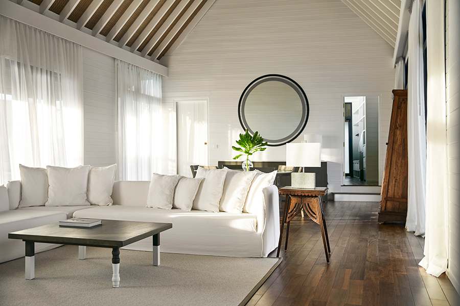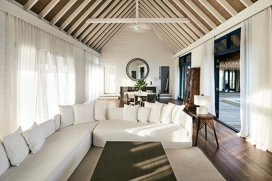 9 Dhoni Water Villas (110 кв.м.) состоят из просторной гостиной со сводчатым потолком и тремя стеклянными стенами открывается панорамный вид на океан и спальни на разных уровнях и частной террасы, имеющей спуск в воду.