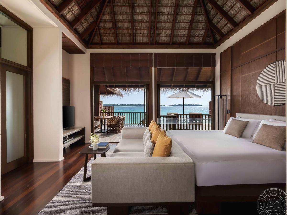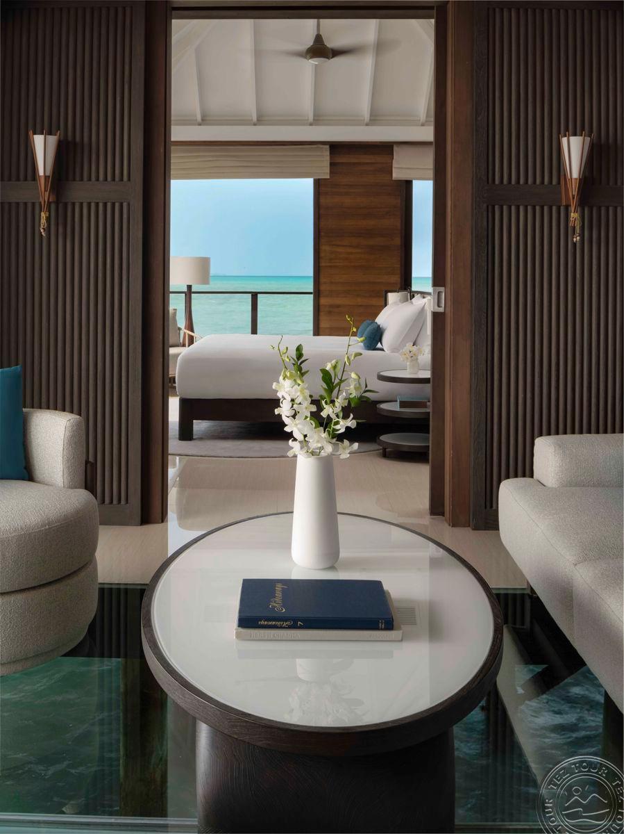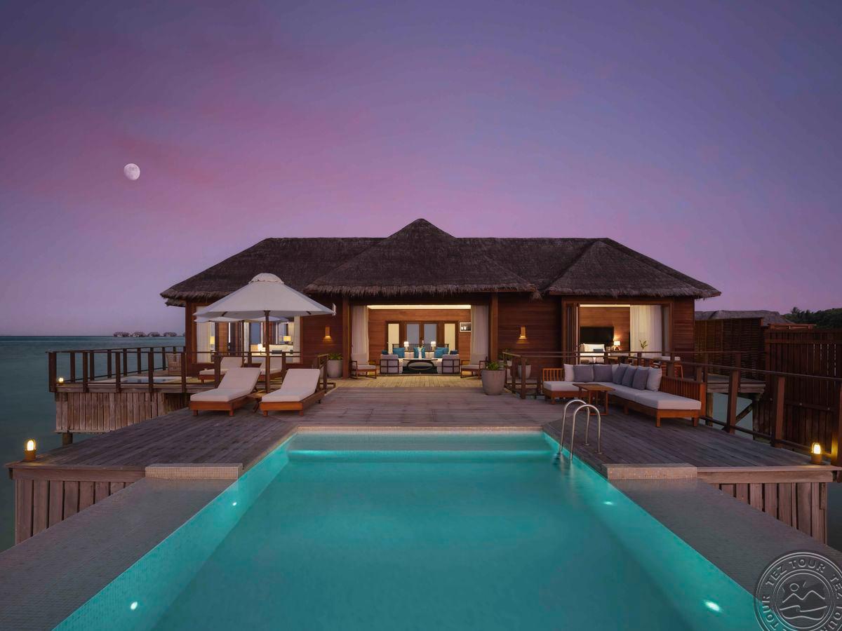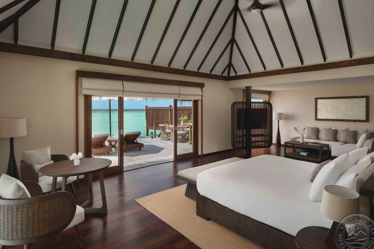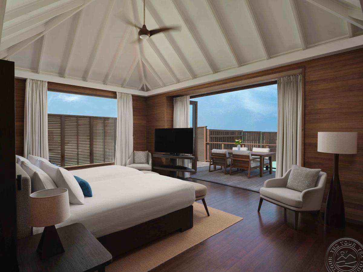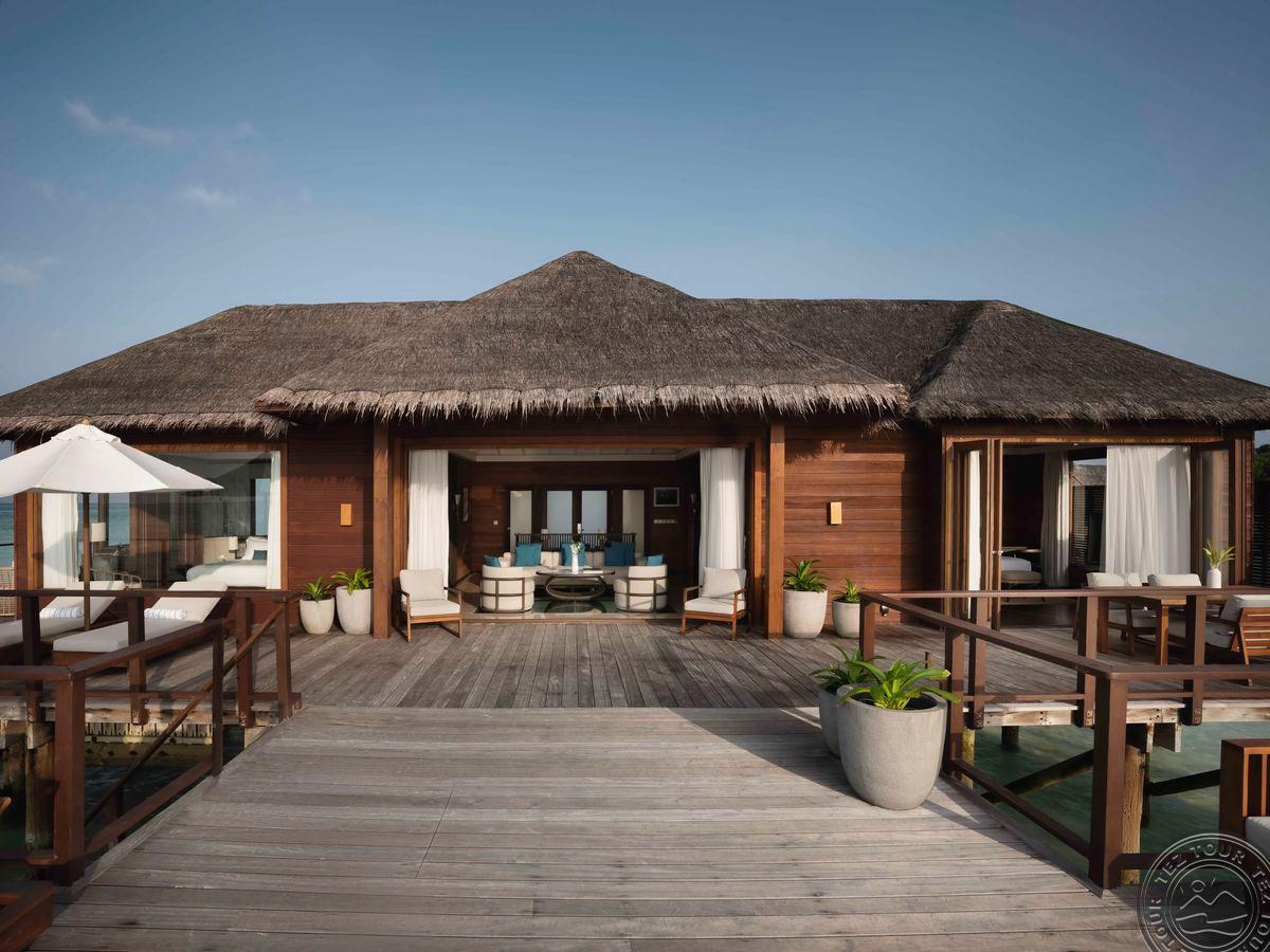 2 Premier Water Villa with Pool (152 м², макс. 3 чел.). Размещение только для взрослых 16+. Водные виллы с видом на океан, кровать king-size. Дизайнерская мебель, скошенные потолки, выбеленные стены, картины мальдивского художника. Терраса с «бескрайним» бассейном и прямым спуском в воду. Ванная комната с ванной и окнами во всю стену. Услуги персонального батлера.