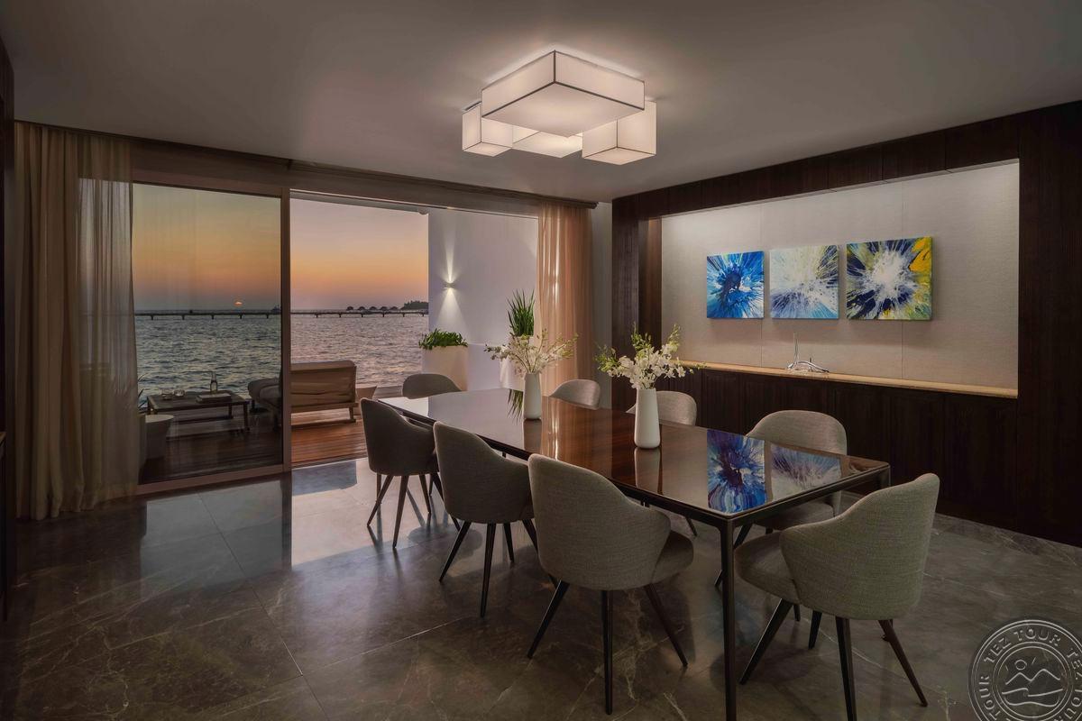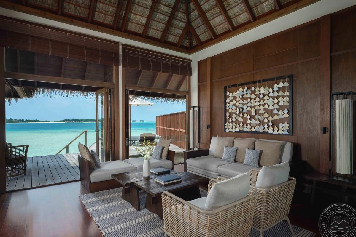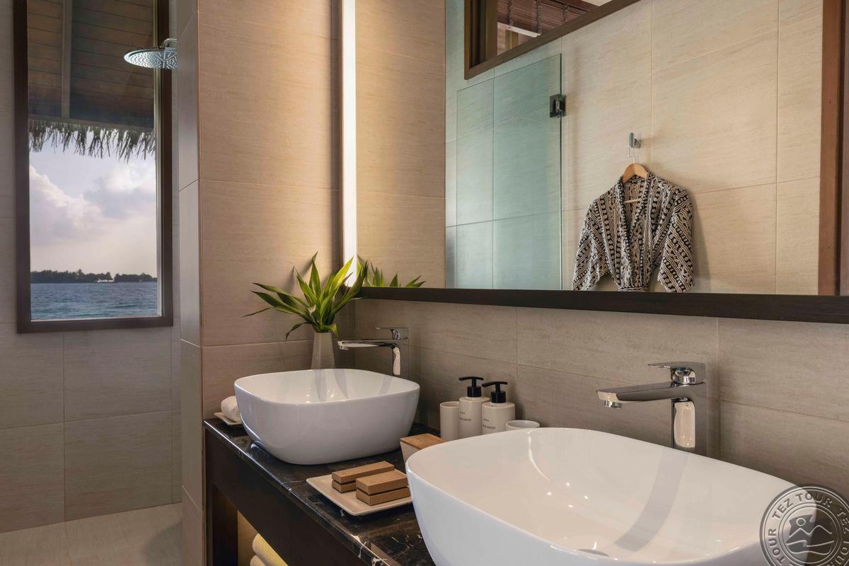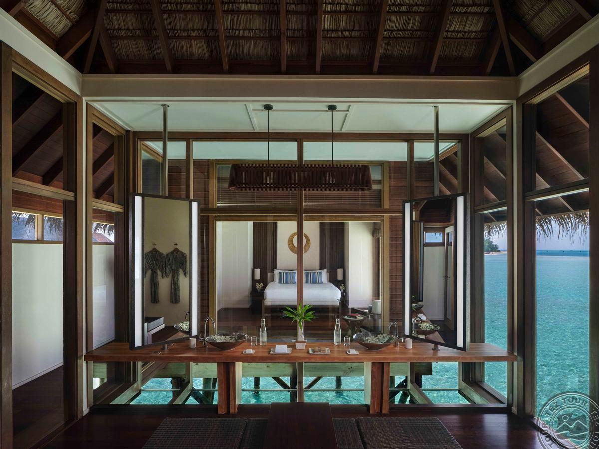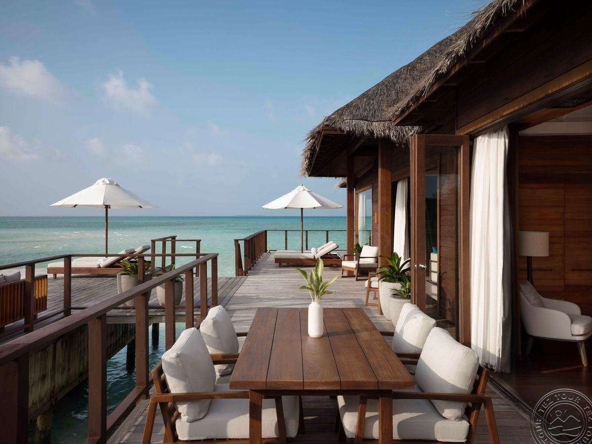 2 Premier Water Villa with Pool (152 м², макс. 3 чел.). Размещение только для взрослых 16+. Водные виллы с видом на океан, кровать king-size. Дизайнерская мебель, скошенные потолки, выбеленные стены, картины мальдивского художника. Терраса с «бескрайним» бассейном и прямым спуском в воду. Ванная комната с ванной и окнами во всю стену. Услуги персонального батлера.