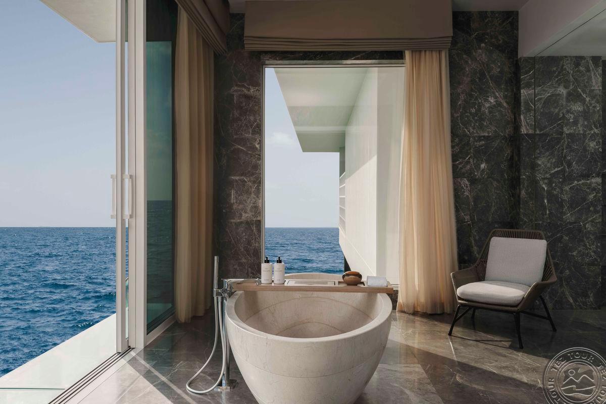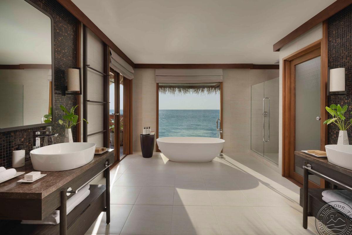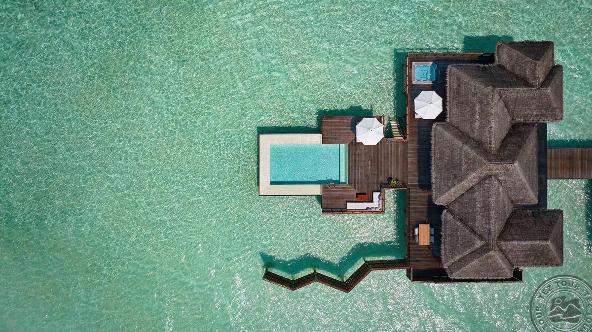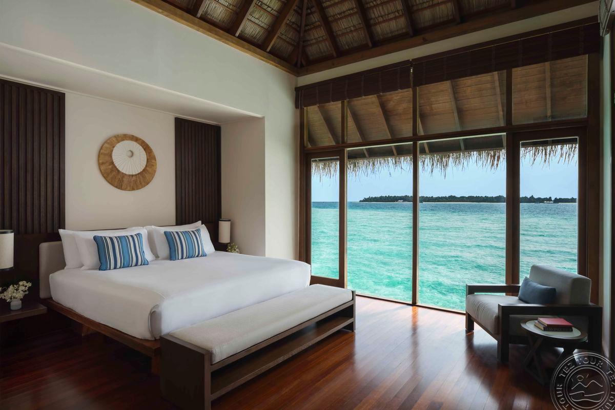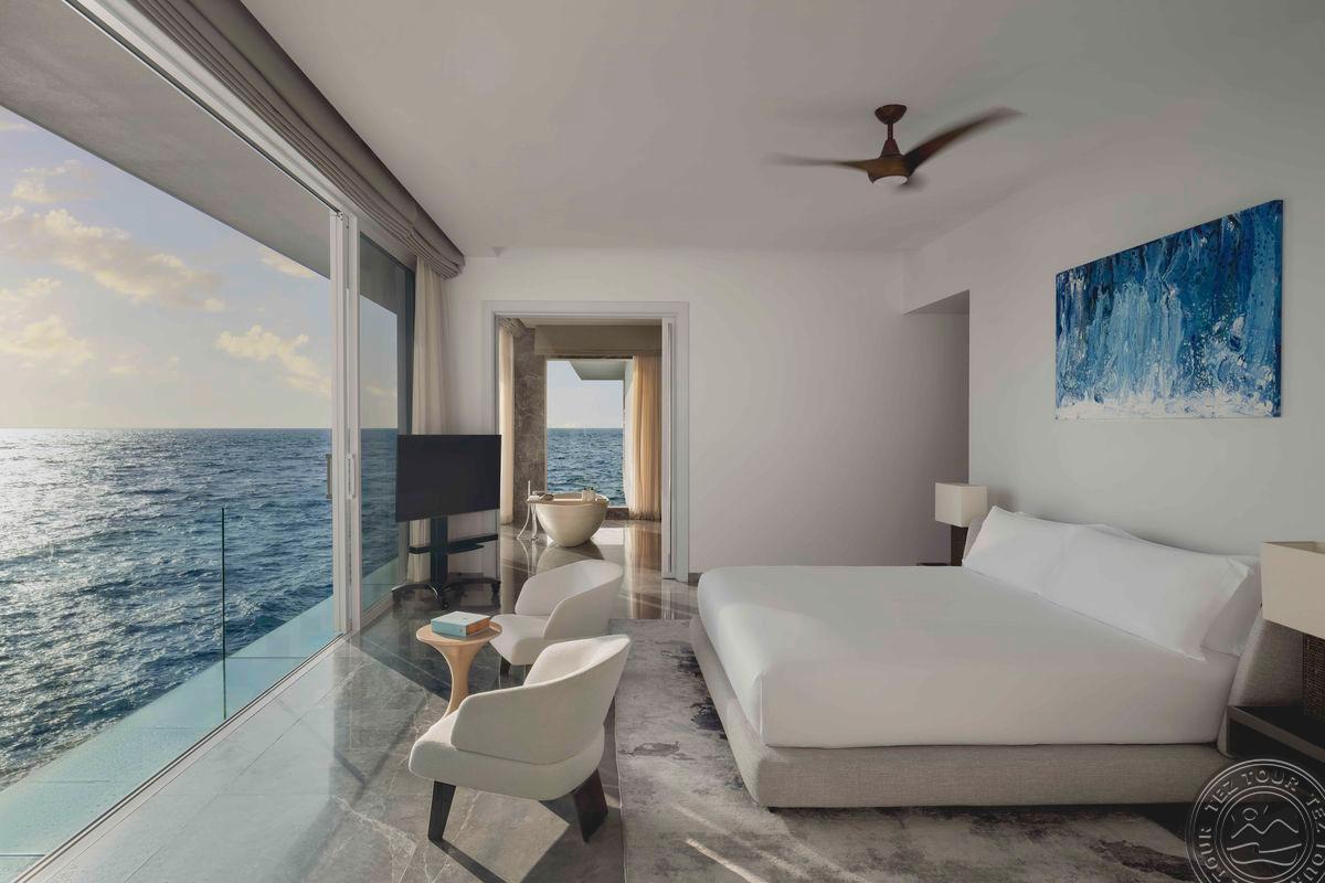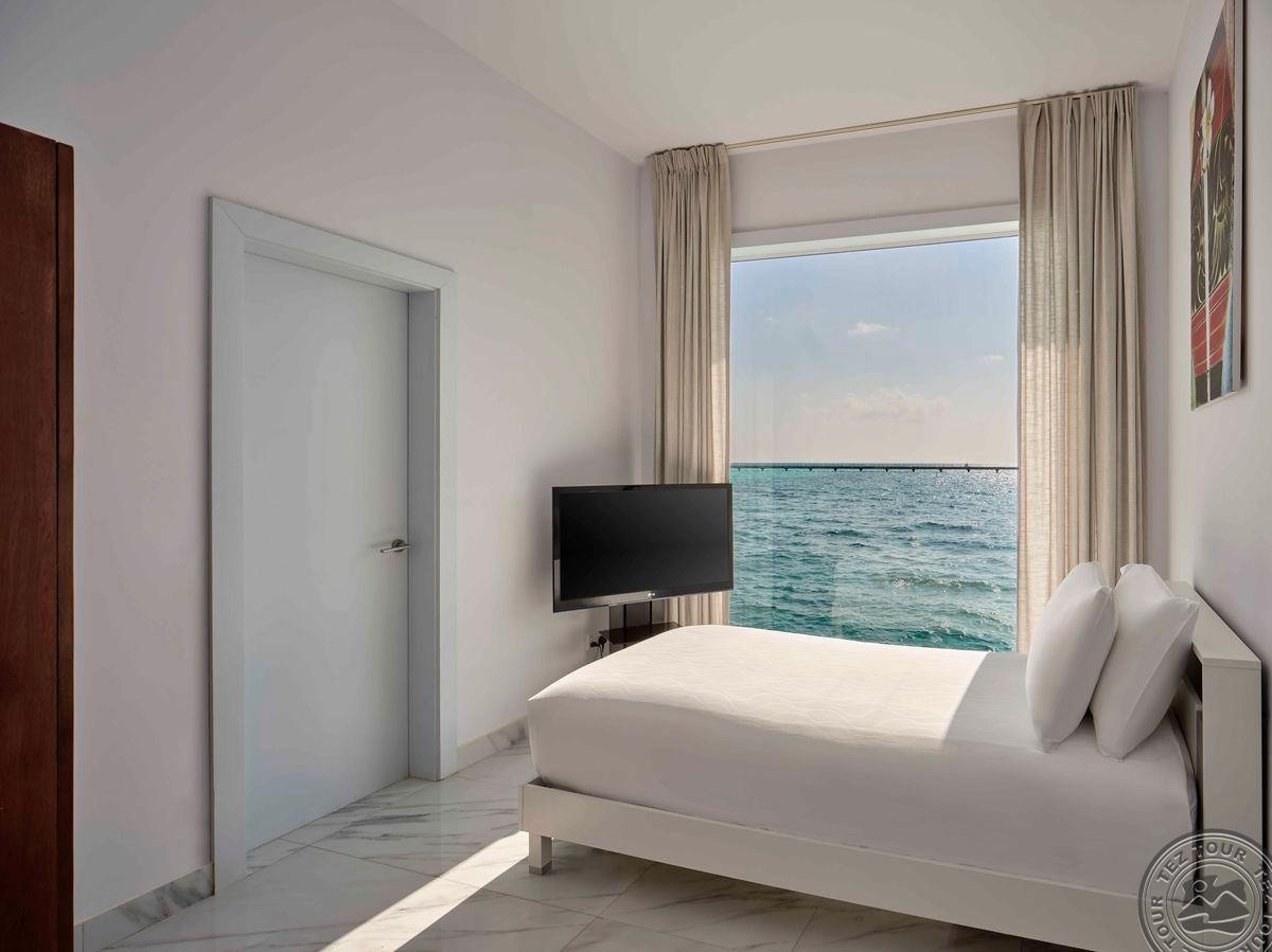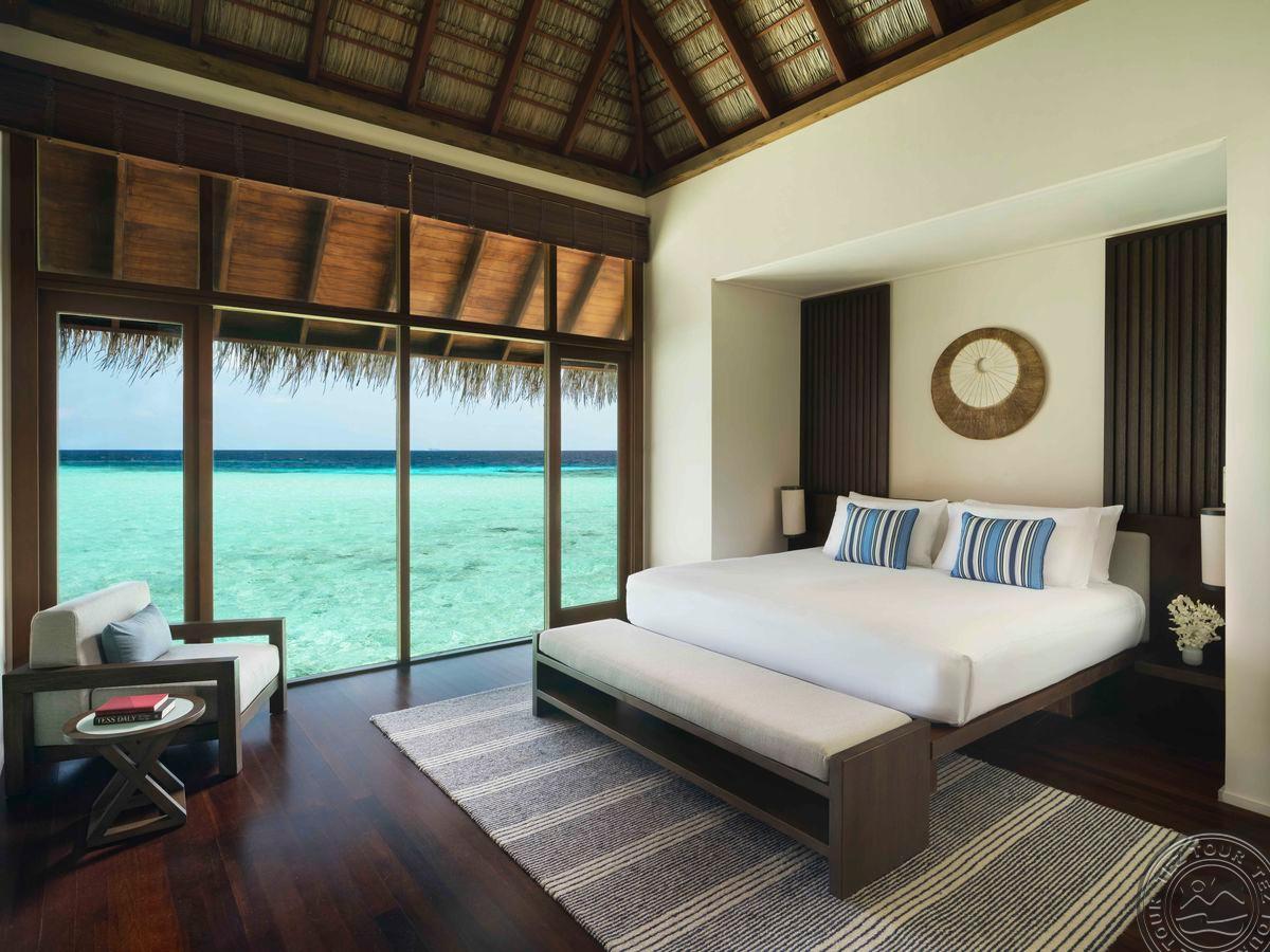 2 Premier Water Villa with Pool (152 м², макс. 3 чел.). Размещение только для взрослых 16+. Водные виллы с видом на океан, кровать king-size. Дизайнерская мебель, скошенные потолки, выбеленные стены, картины мальдивского художника. Терраса с «бескрайним» бассейном и прямым спуском в воду. Ванная комната с ванной и окнами во всю стену. Услуги персонального батлера.