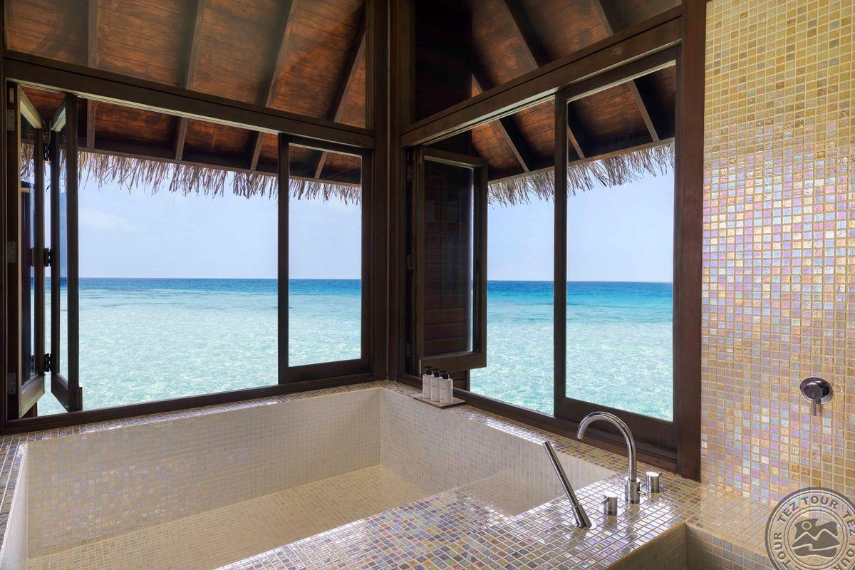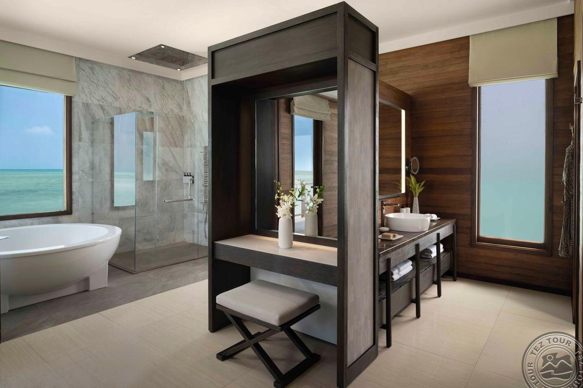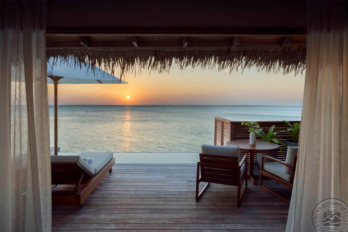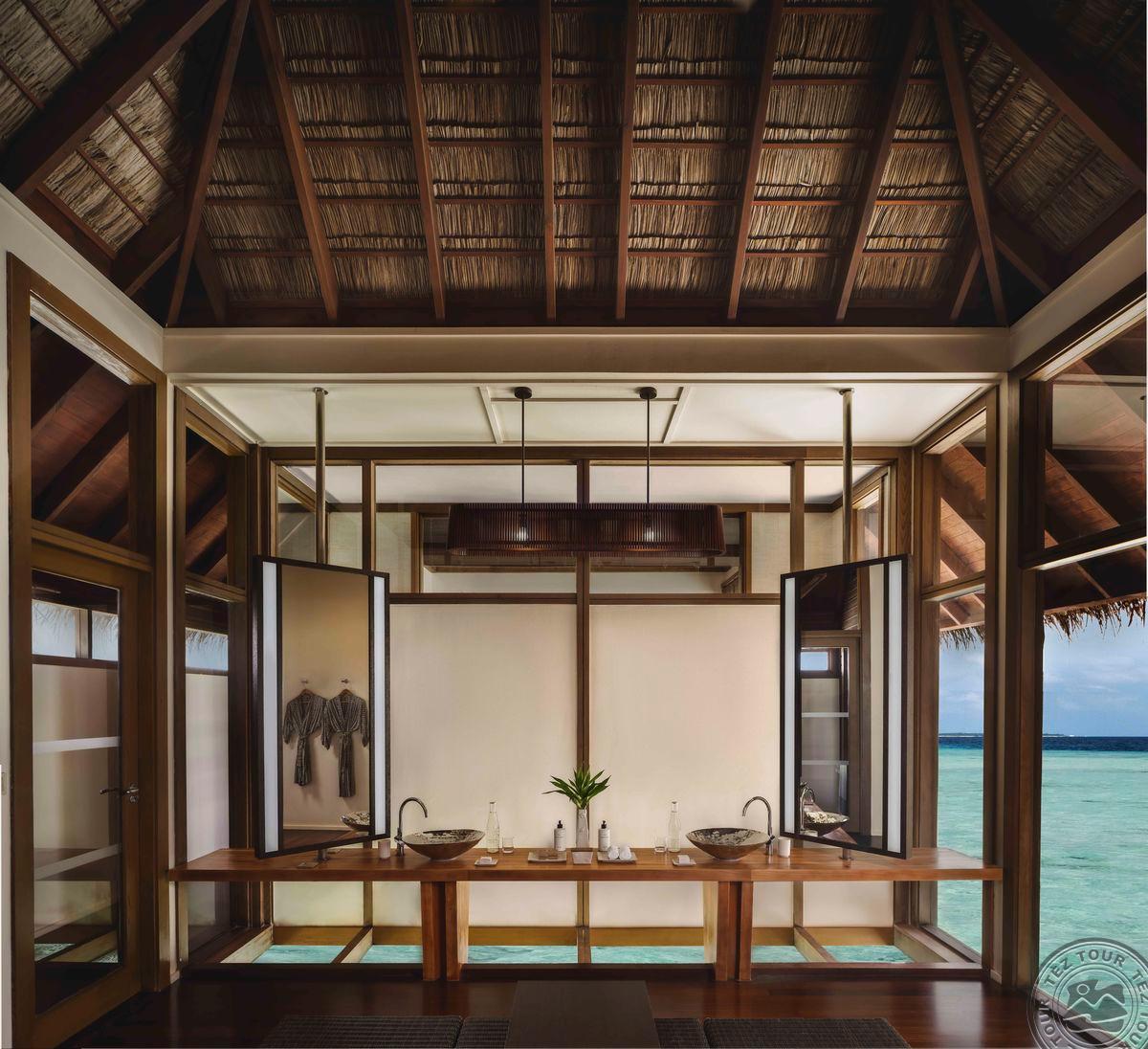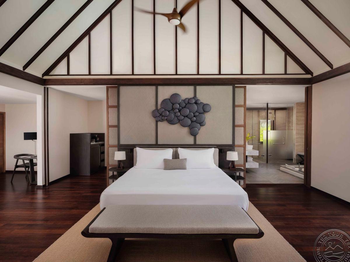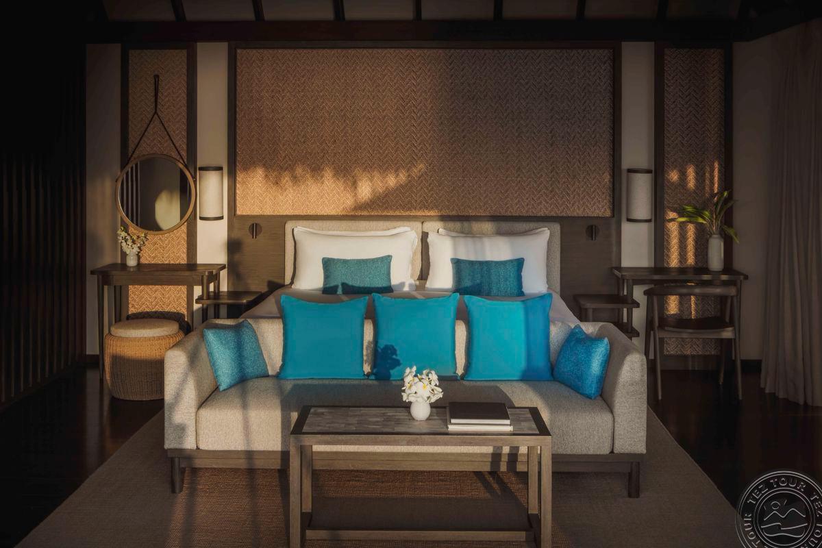 2 Premier Water Villa with Pool (152 м², макс. 3 чел.). Размещение только для взрослых 16+. Водные виллы с видом на океан, кровать king-size. Дизайнерская мебель, скошенные потолки, выбеленные стены, картины мальдивского художника. Терраса с «бескрайним» бассейном и прямым спуском в воду. Ванная комната с ванной и окнами во всю стену. Услуги персонального батлера.