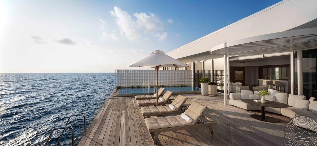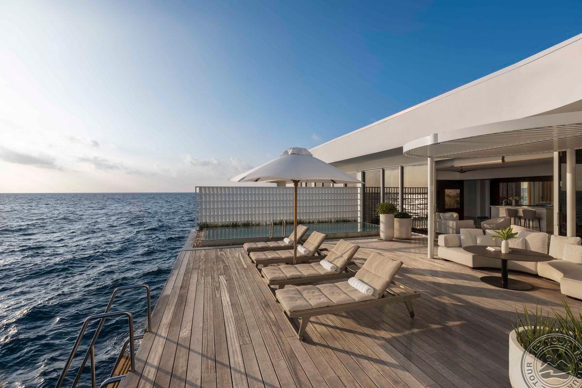 6 Deluxe Water Villa with Pool (115 м², макс. 3 чел.). Размещение только для взрослых 16+. Водные виллы с видом на океан и закат. Просторная зона гостиной. Спальня с кроватью king-size с регулируемой осветительной системой, медиа-центром с системой объемного звука. Терраса с прямым спуском в воду и джакузи.