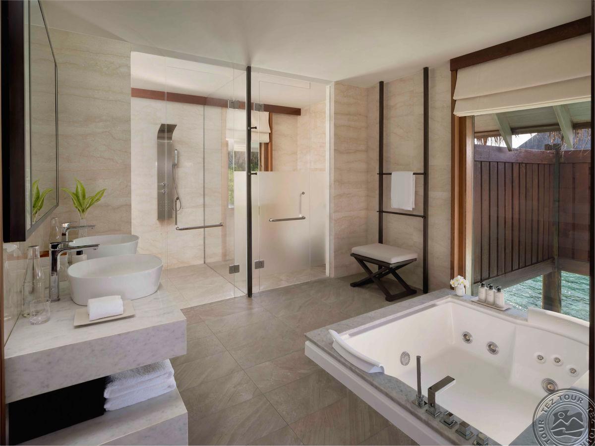 6 Grand Water Villa (150 м², макс. 3 чел.). Водные виллы, расположенные в зоне The SPA Retreat. 2 отдельные комнаты: спальня и гостиная, кровать king-size. Ванная комната с гардеробной, ванной. Терраса с джакузи и прямым спуском в воду.