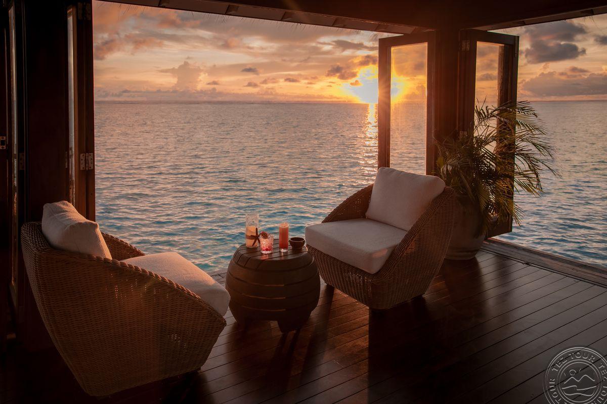 12 Sunrise Water Villa (86 м², макс. 3 чел.). Размещение только для взрослых 16+. Водные виллы улучшенной планировки. Спальня с кроватью king-size с прямым видом на океан и закат. Терраса с джакузи и прямым спуском в воду.