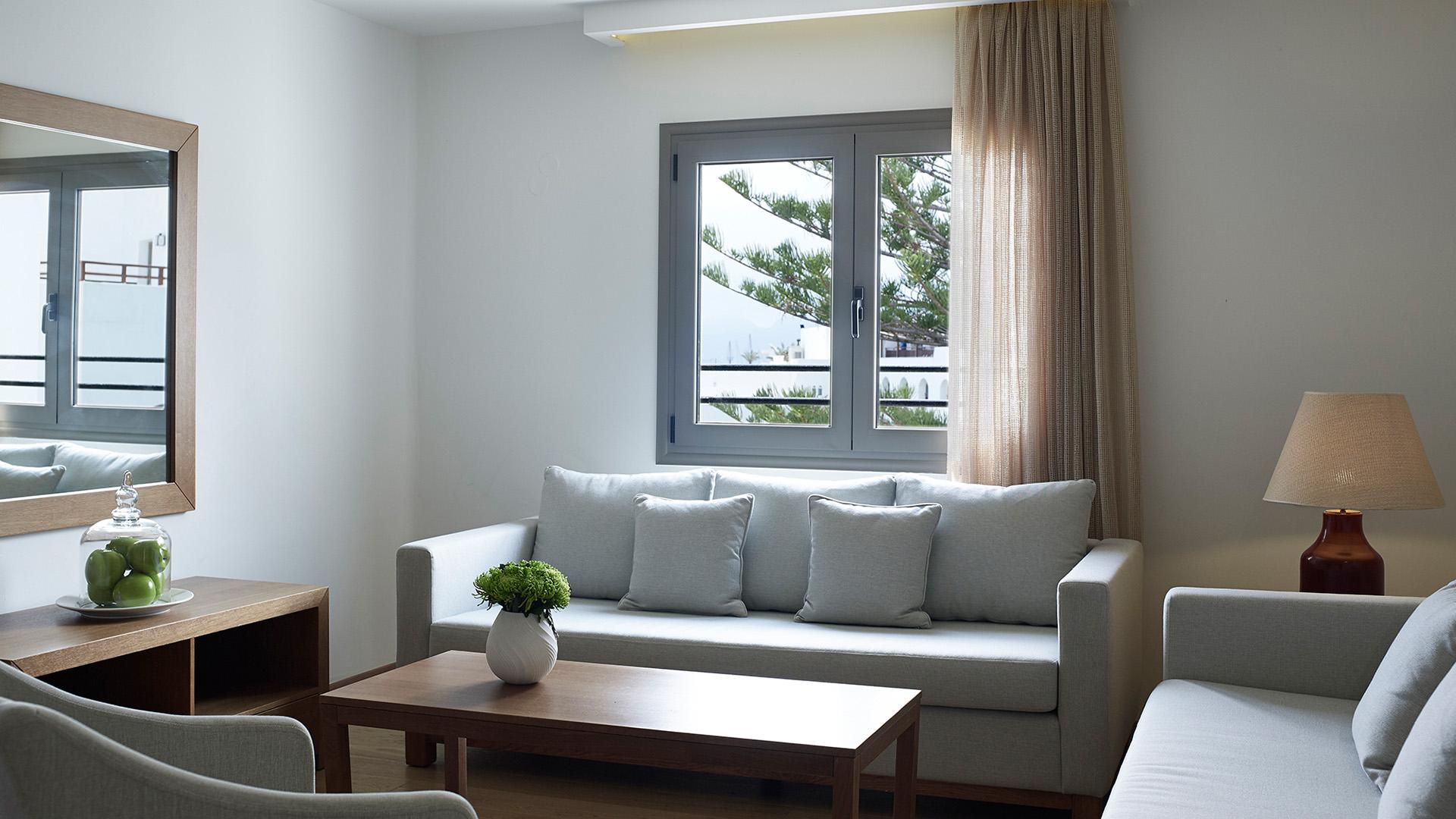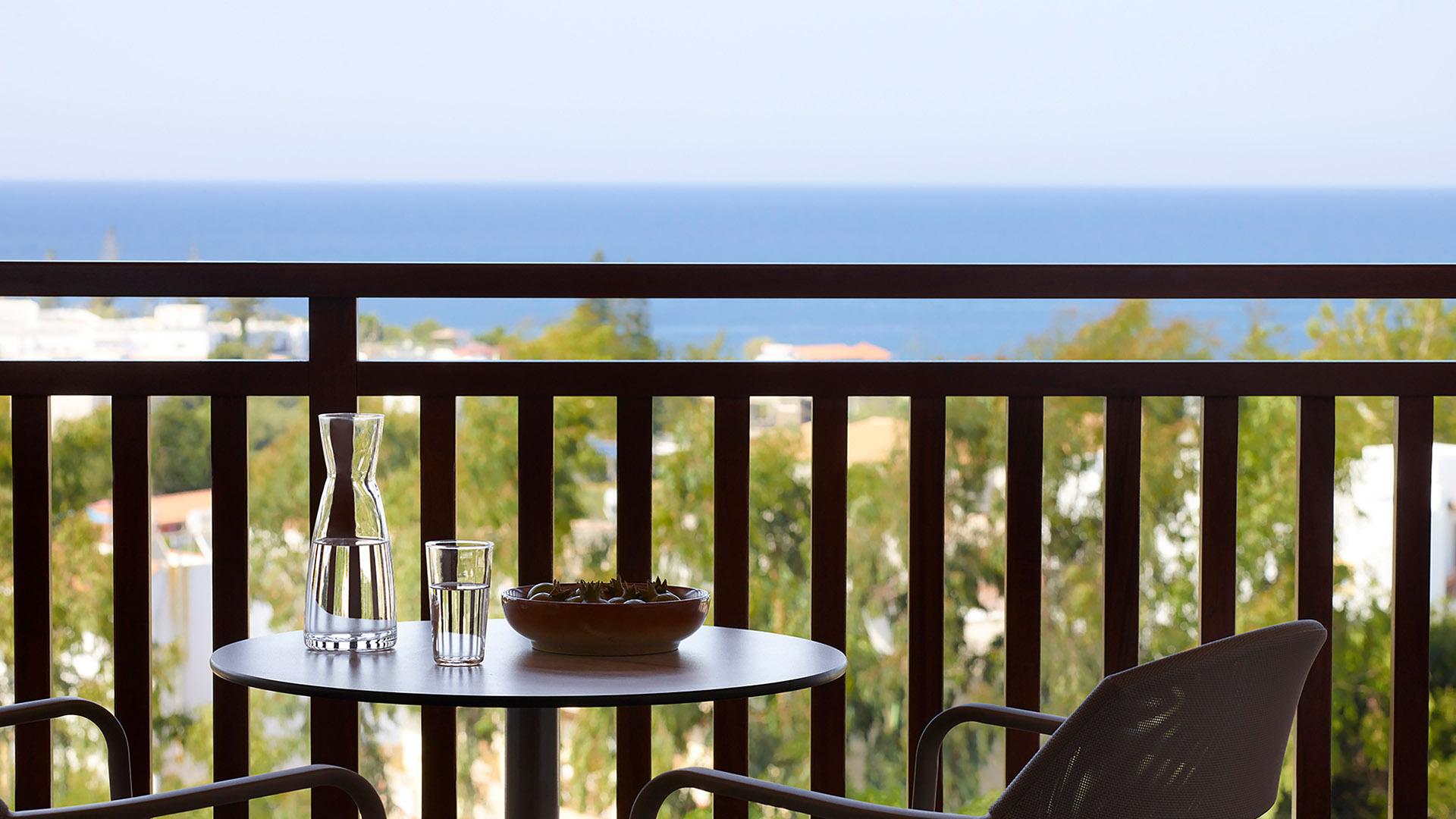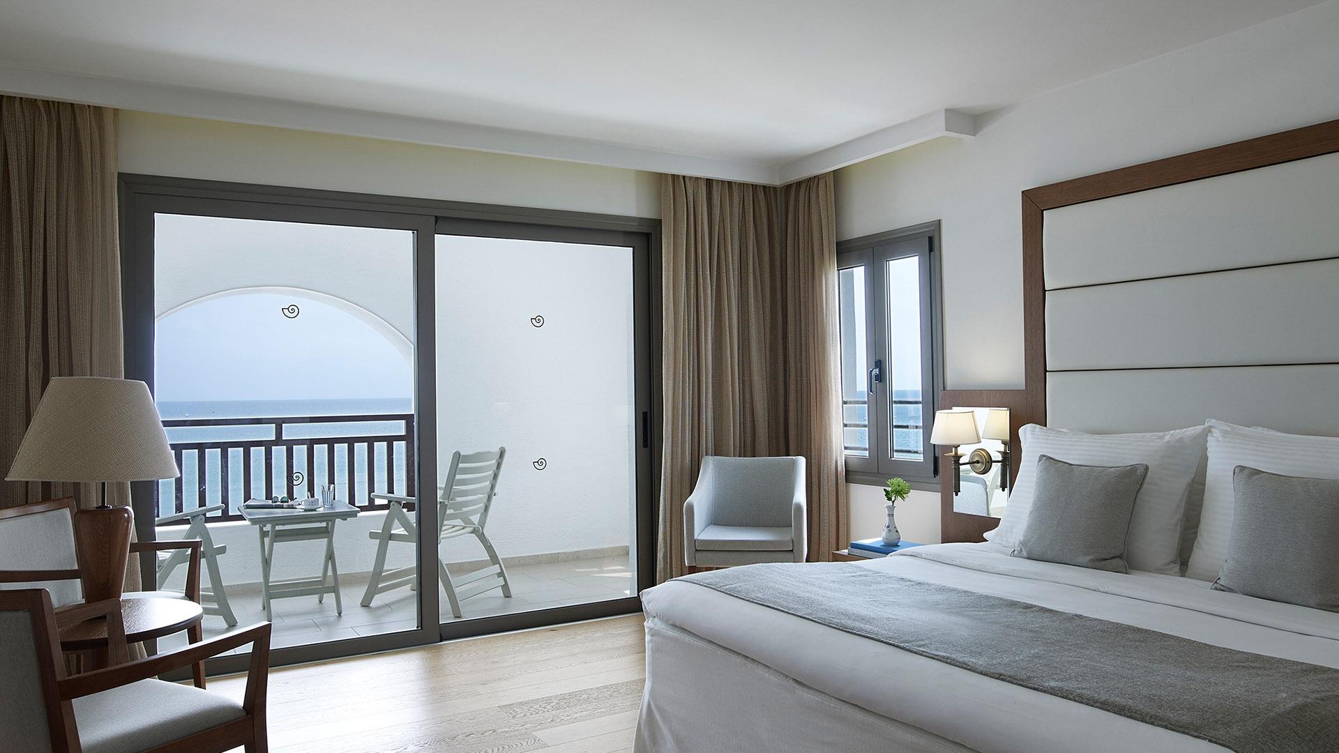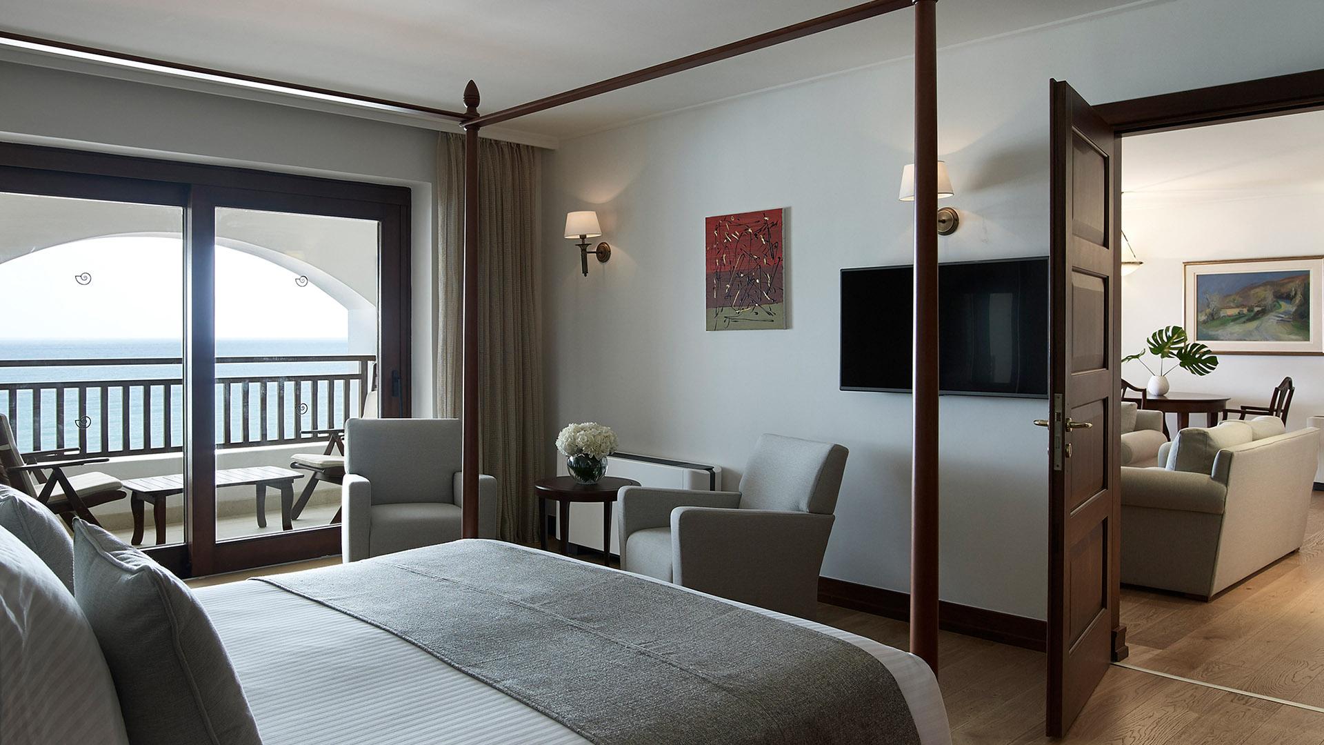 - Premium Suite Sea View – 50-74 кв.м (макс. 4): корпуса Maris и Terra; спальня с кроватью king-size либо 2 односпальными кроватями, отдельная гостиная с 2 диванами-кроватями, 1 или 2 ванные комнаты с ванной или душевой, оборудованный балкон или терраса с видом на море