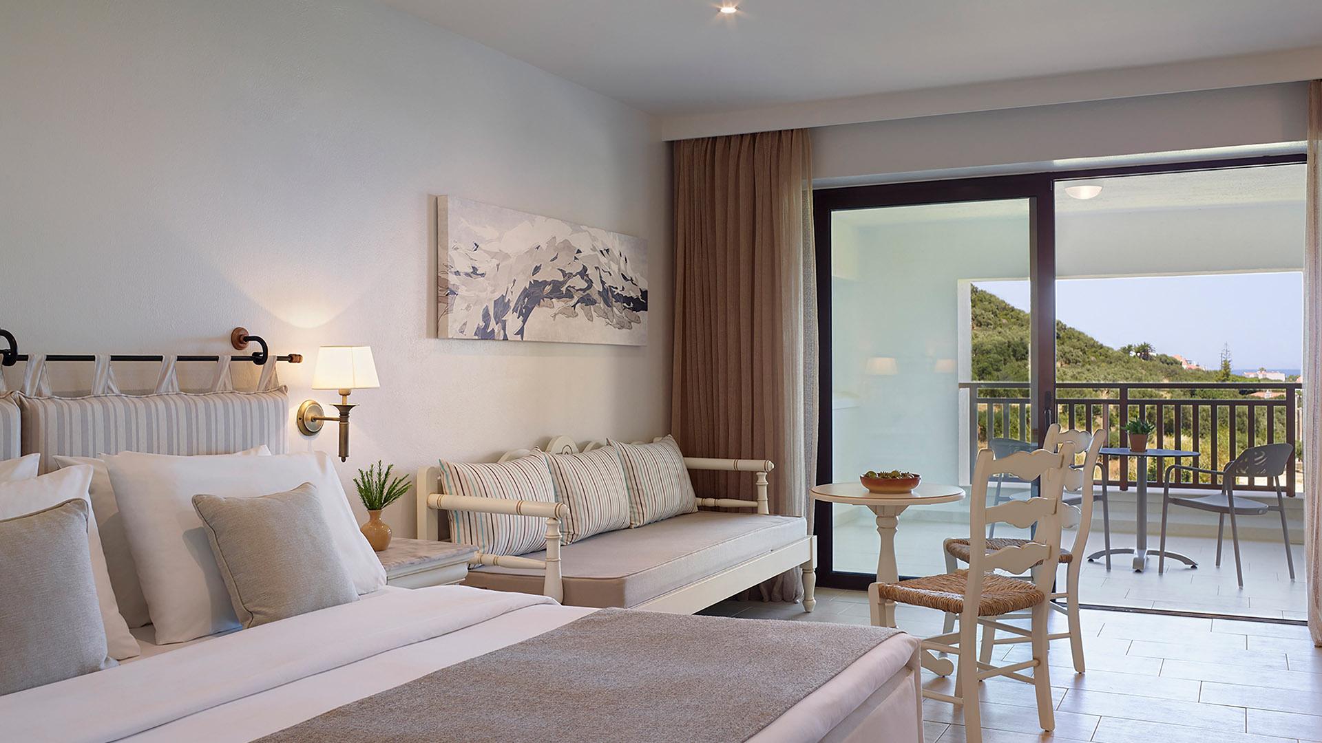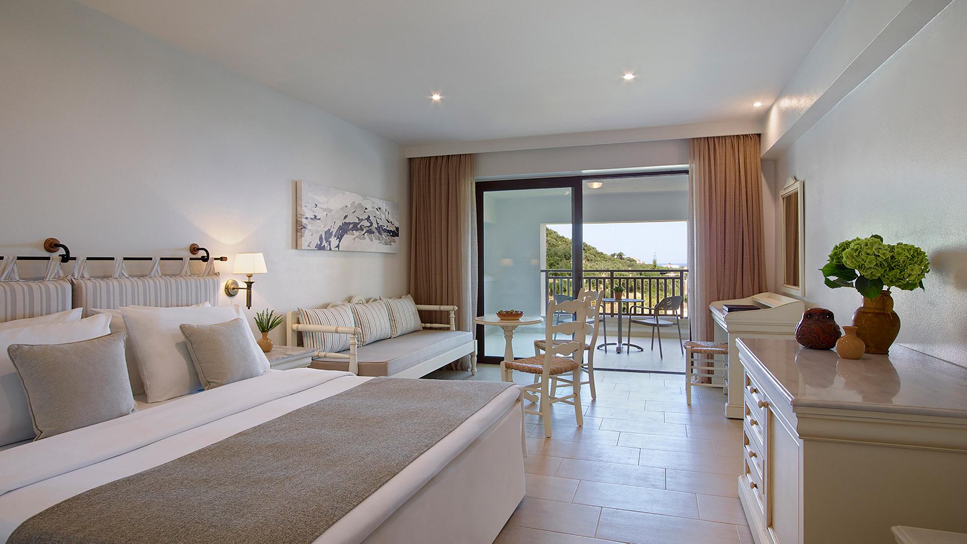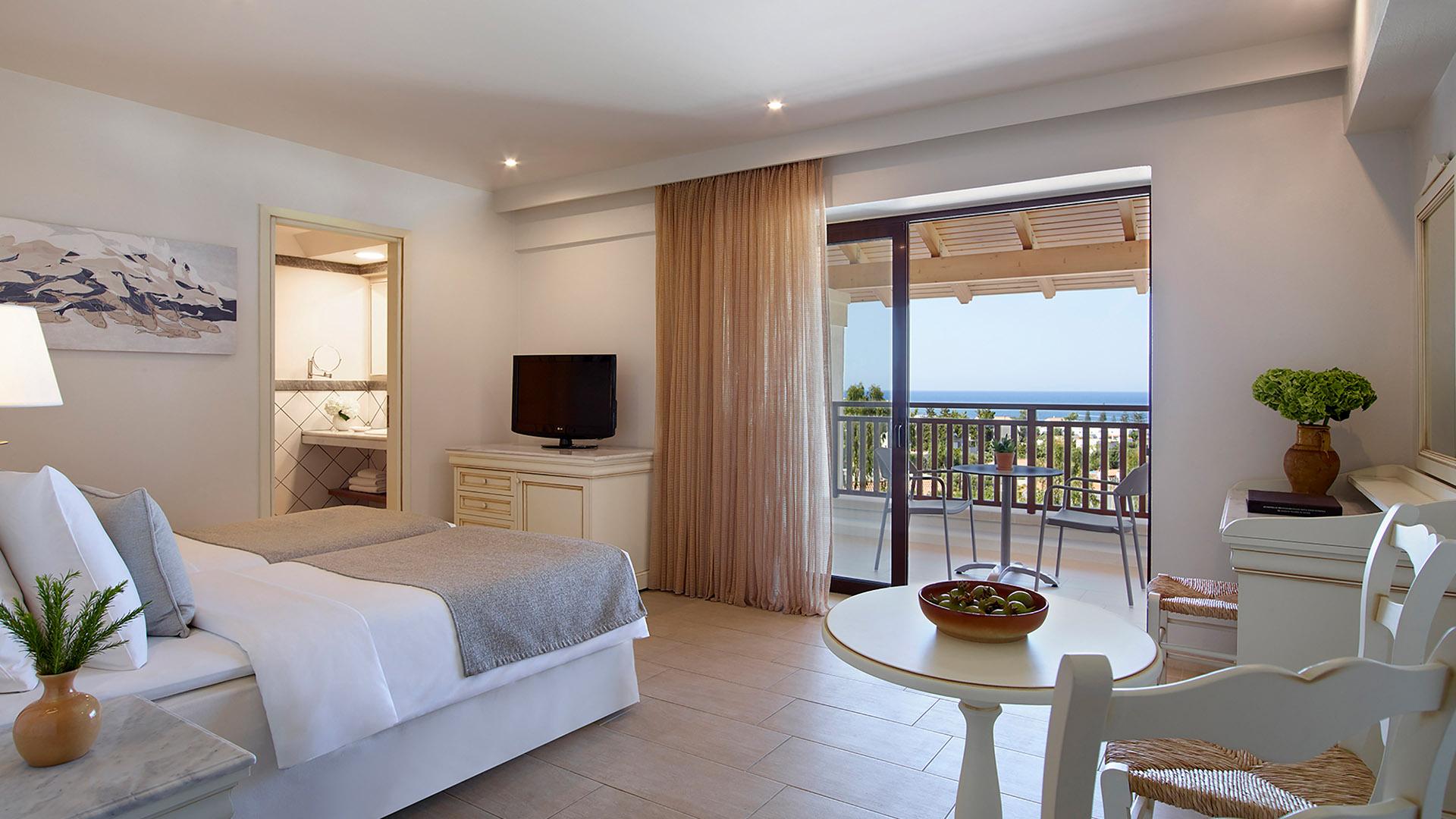 - Deluxe Room Sea View – 27-30 кв.м (макс. 3): корпуса Maris и Terra, зона бунгало; номер открытой планировки с кроватью king-size либо 2 односпальными кроватями, ванная комната с ванной или душевой, оборудованный балкон или терраса с видом на море