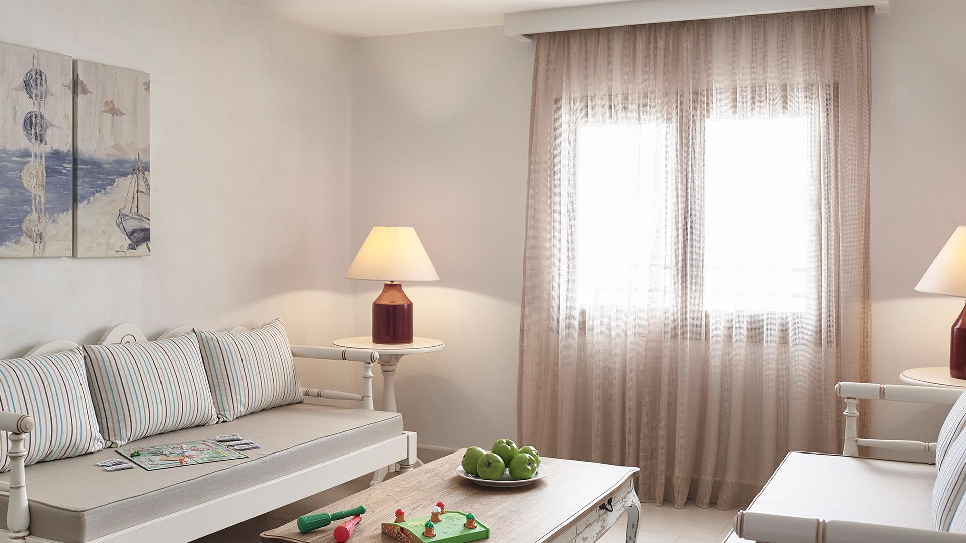 - Family Room One Bedroom – 38-73 кв.м (макс. 4): корпуса Maris и Terra, бунгало; спальня с кроватью king-size либо 2 односпальными кроватями, отдельная гостиная, 1 либо 2 ванные комнаты с ванной каждая, 2 диван-кровати, оборудованная терраса или балкон с видом на сад