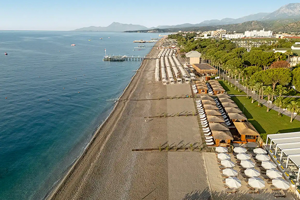 Отель имеет собственный песчано-галечный пляж (400 м) от отеля до пляжа 150 м. Шезлонги, навесы и пляжные полотенца — бесплатно.