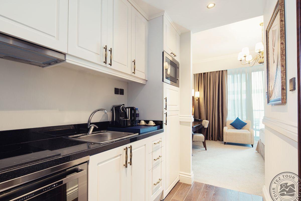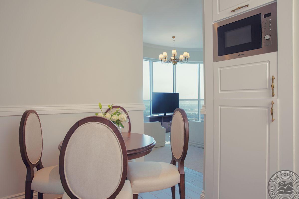 24 номера 1 Bedroom Premium Appartment (16-17 этажи, вид на город или частичный вид на море, гостиная, спальня с дверью, кровать king-size, кухонный уголок (холодильник, микроволновая печь, плита, духовка, посудомоечная машина, тостер, кухонные принадлежности), стиральная машина, балкон не во всех номерах, макс. 4 чел., 50-76 м2, привилегии).