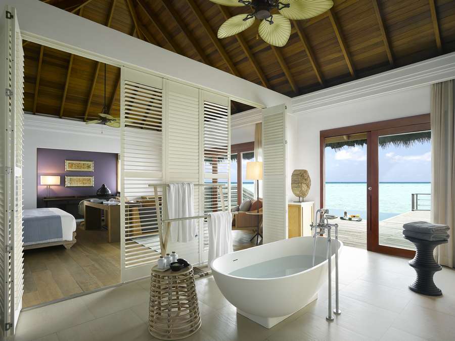 - (02) Two Bedrooms Overwater Pool Pavilion (ex.Two Bedroom Ocean Pavilion with Pool) (Площадь 370 кв.м.) Вилла с двумя спальнями и бассейном, расположенная над океаном предлагает уединиться в райском местечке с видом на закат. Состоит из отдельной гостиной с обеденной зоной и мини-кухней, двух спален ( каждая имеет собственную ванную комнату), просторной террасы с зонами отдыха, обеденной зоной, бассейном и спуском в воду.