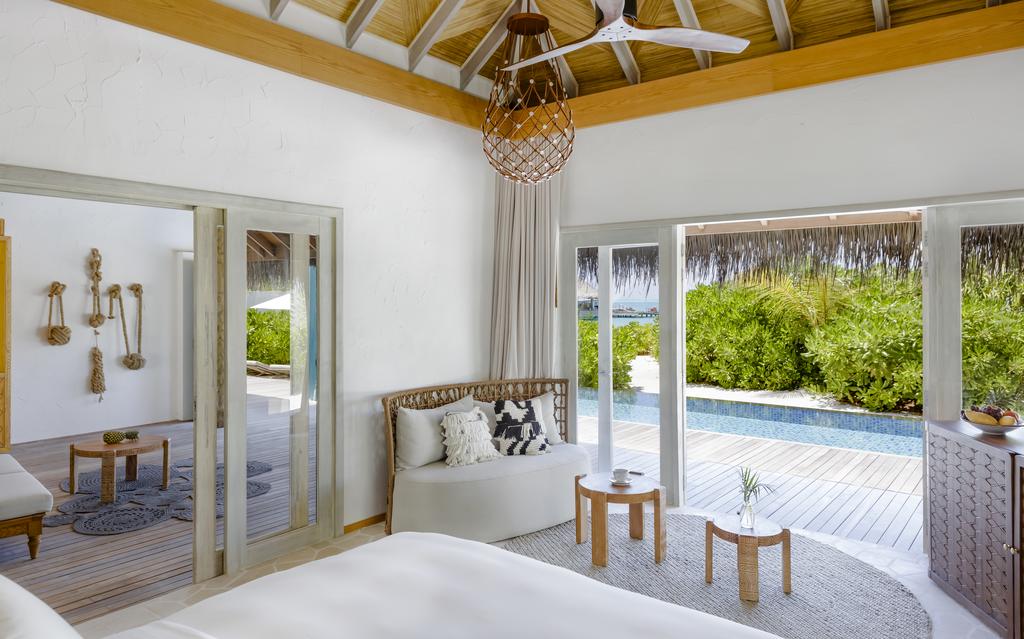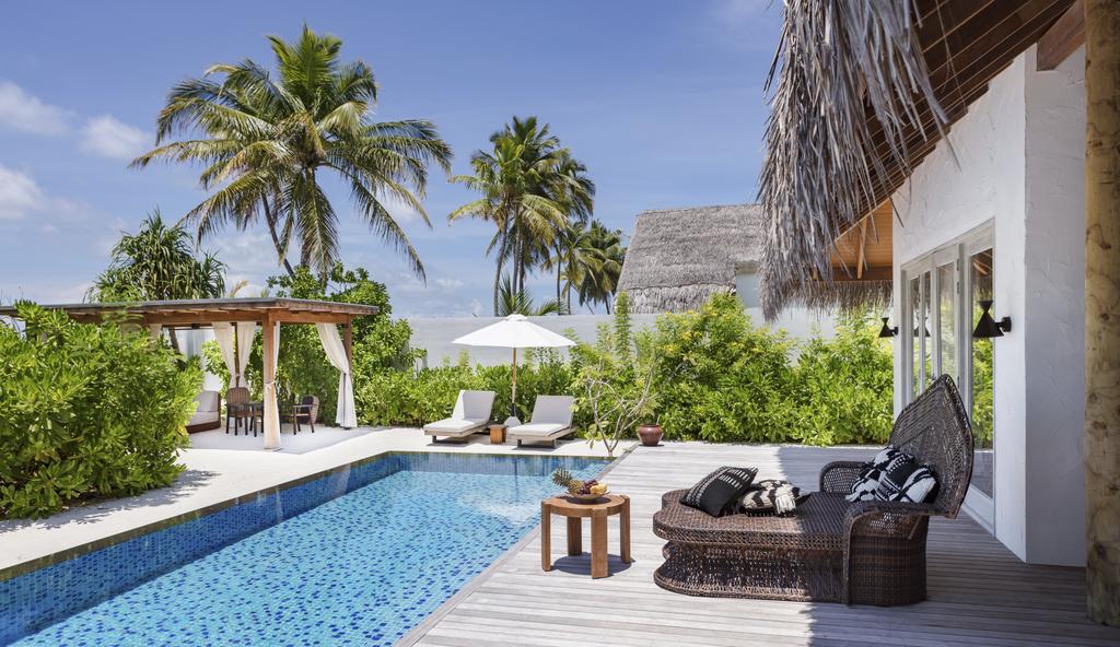 4 Two Bedroom Beach Sunset Villa (750 м2, макс. 6 или 4+2 чел.). Береговые виллы с видом на закат и прямым выходом на пляж. Две спальни с кроватями California king-size, просторная гостиная зона открытого плана с обеденным столом, две крытые кондиционированные ванные комнаты с душем + ванна и душ на открытом воздухе. Терраса с частным бассейном (48 м2), беседка для отдыха. Номера идеально подходят для размещения семей с детьми и дружеских компаний.