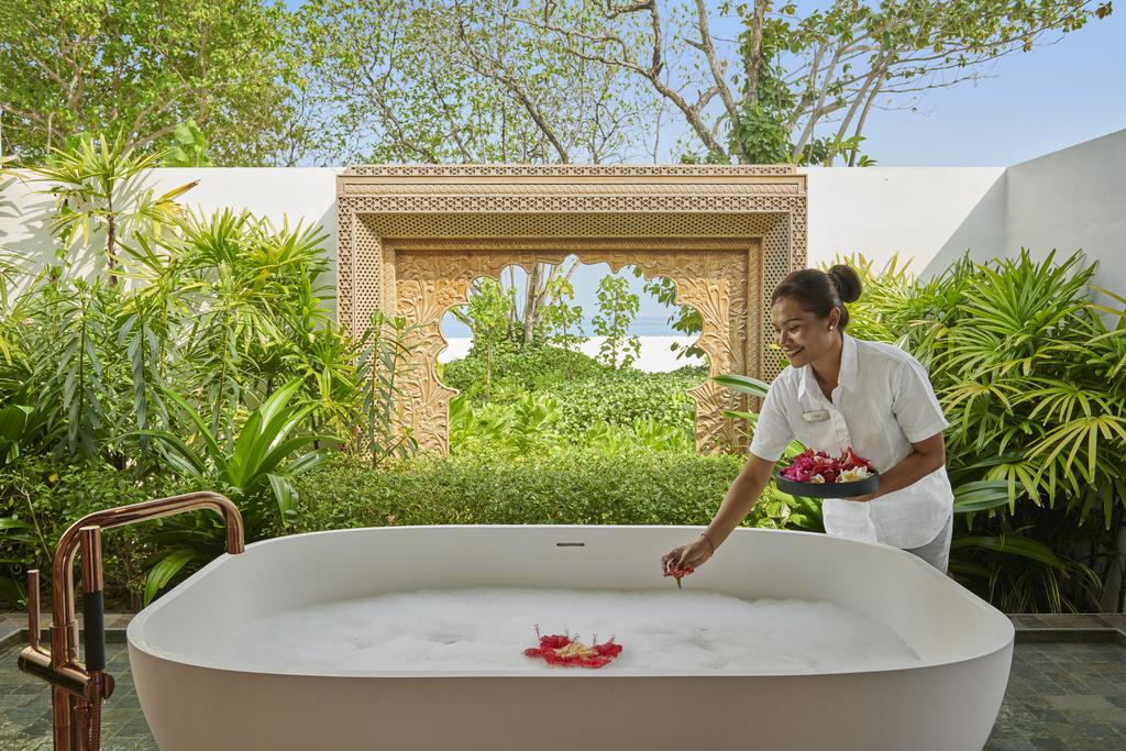 30 Beach Sunrise Villa (360 м2, макс. 3 или 2+2 чел.). Береговые виллы с видом на восход и прямым выходом на пляж. Спальня с кроватью California king-size, небольшая гардеробная зона, крытая кондиционированная ванная комната с душем + ванна и душ на открытом воздухе. Терраса с частным бассейном (14 м2), беседка для отдыха.