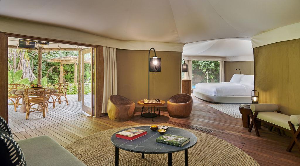 5 Tented Jungle Villa (560 м2, макс. 3+3 или 2+4 чел.). Виллы интересного дизайна, расположенные в глубине острова среди пыйшной тропической растительности. Две сапльни – взрослая и детская, ванная комната частично открытого плана, отдельная гостиная зона частично открытого плана, терраса с шезлонгами, беседка с тахтой для отдыха, частный бассейн.
