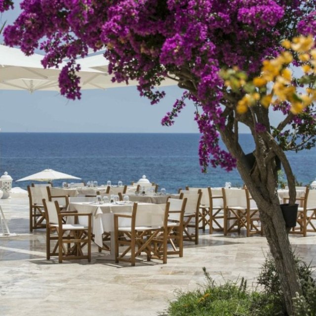ресторан с панорамной террасой и видом на море, ресторан на пляже, 1 бар лаунж, 1 бар у бассейна, уголок для детей со «шведским столом»