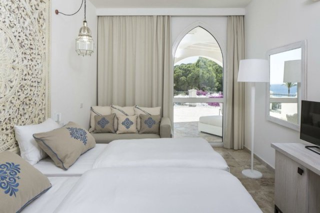 Family Suite Garden View (42 м2): терраса 21 м2, семейные номера повышенной комфортностью. В детской - две кровати и достаточно места для малышей. Отдельная спальная с двуспальной кроватью и софой в средиземноморском стиле; максимальное размещение 4 взр. или 4 взр. и 1ребенок