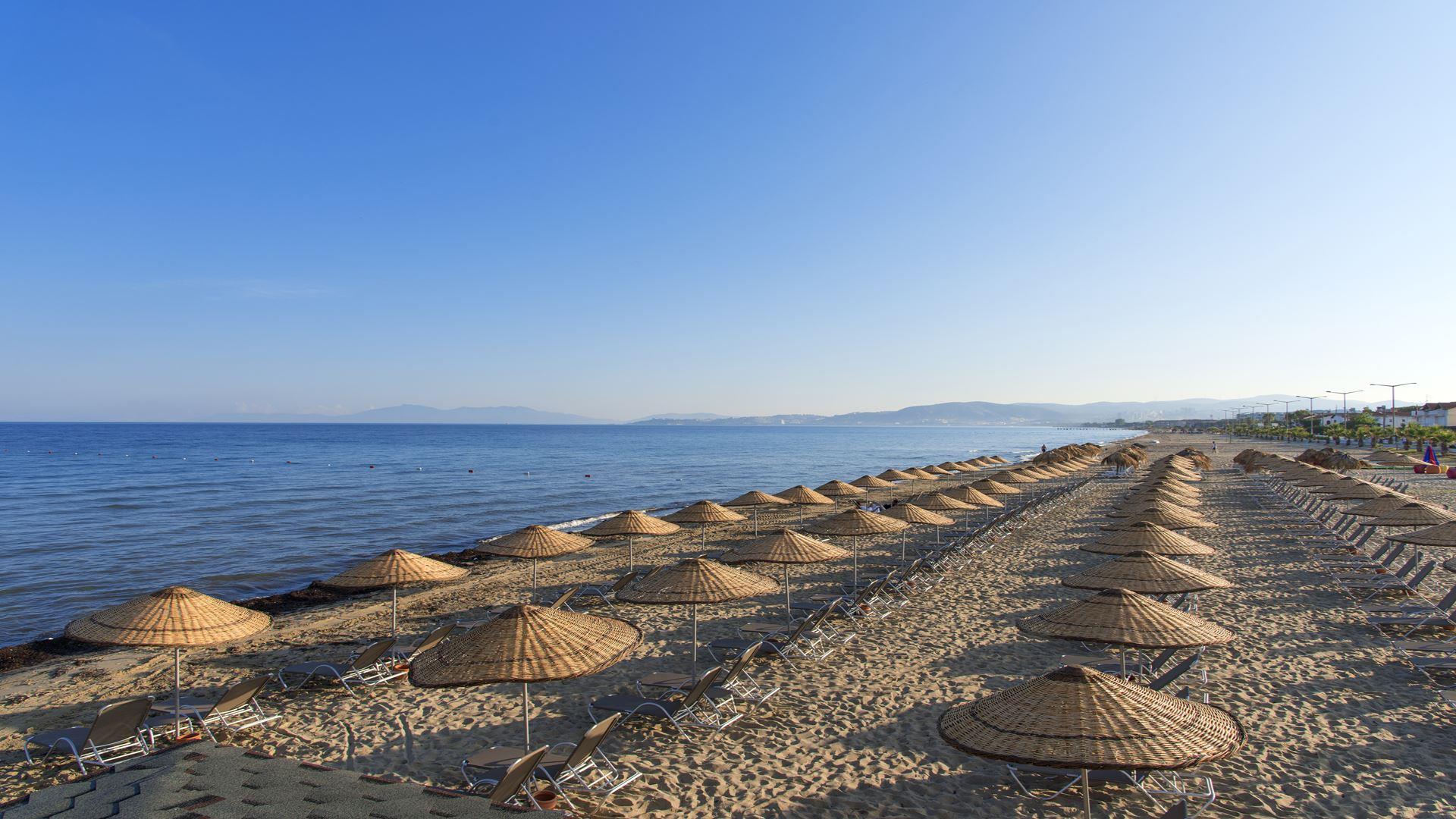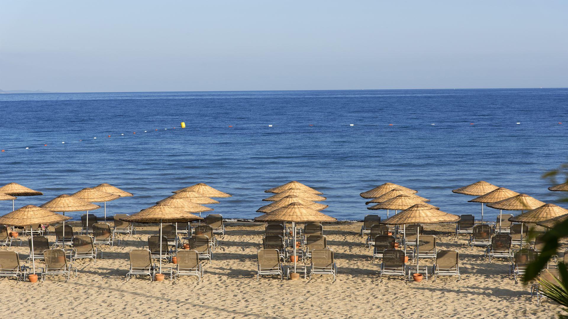 Собственный песчаный пляж находится рядом с отелем.