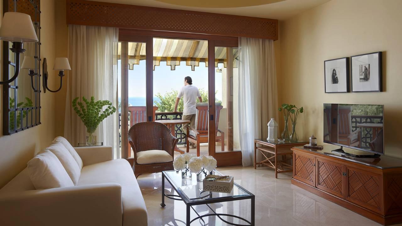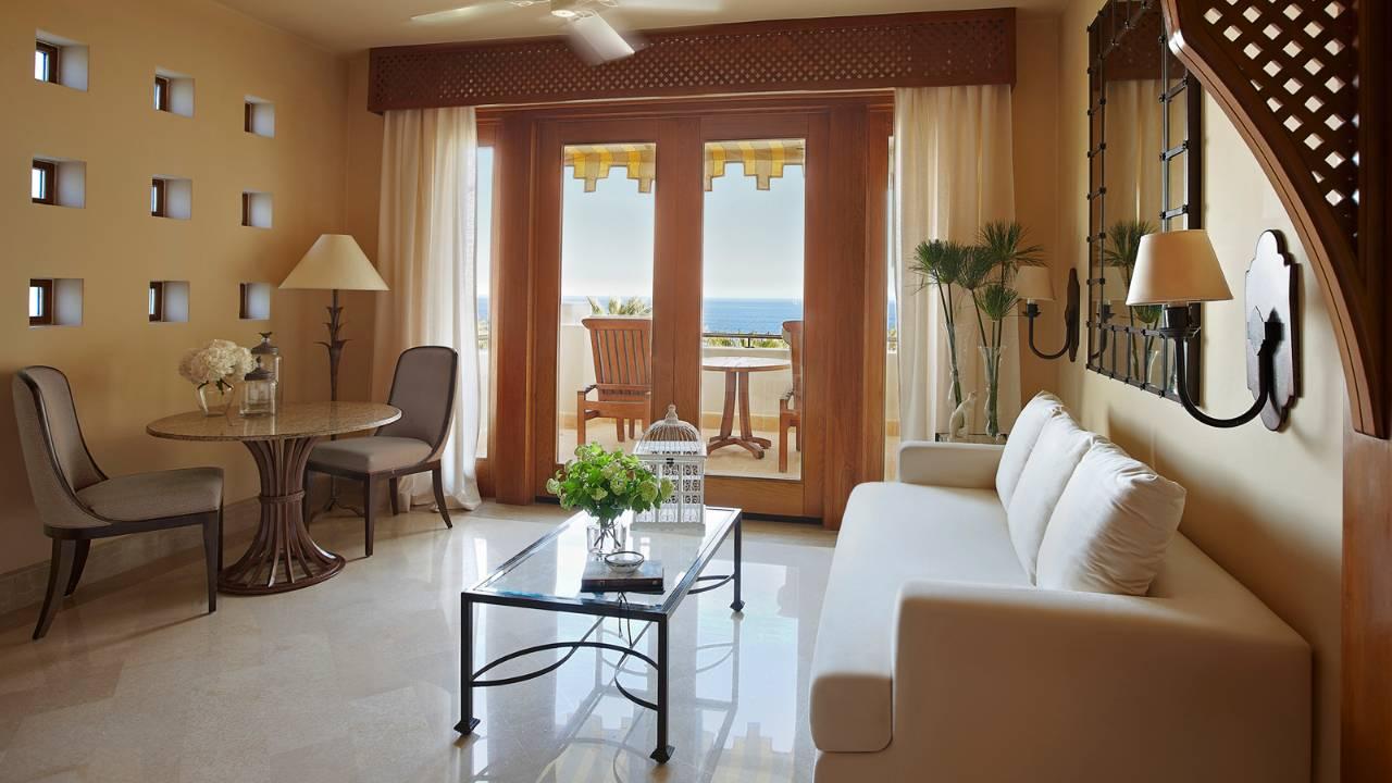 : площадь номера 375 кв.м, шикарный и просторный номер, оформленный в восточном стиле номер, имеет свою террасу, внутренний двор с бассейном. Состоит из отдельной спальни, гостиной, обеденной комнаты. В гостиной комнате большой телевизор со стереосистемой и CD-плеером. - Three Bedroom Royal Suite номер площадью 490 кв.м, шикарный и просторный номер, имеет свою террасу и внутренний двор, бассейн, джакузи, свой выход на пляж. Состоит из трех спален, гостиной и обеденной комнаты. В каждой спальне отдельная ванная комната. Вид из номера на море.
