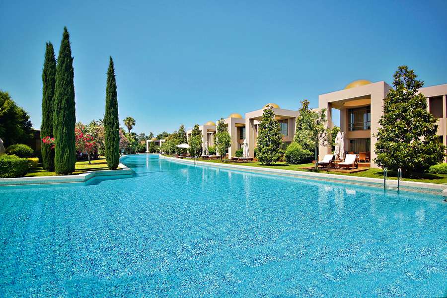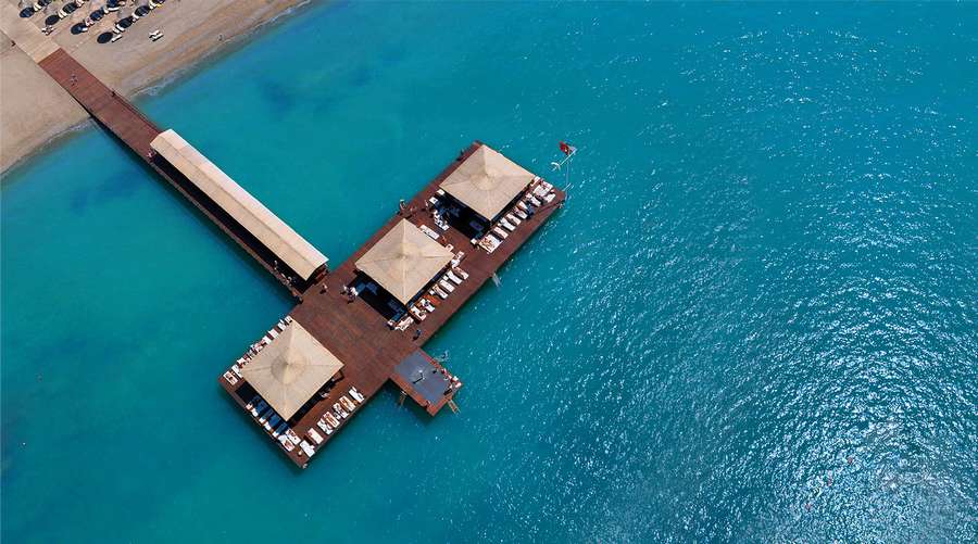 Открытые и крытые бассейны как для взрослых, так и для детей. Открытые бассейны расположены в прелестных садах, где Вы можете насладиться окружающей Вас природой и пением птиц. 300 м частный песчаный пляж со стильными павильонами и великолепным пирсом. В аквапарке отеля 8 различных горок, от больших до маленьких.