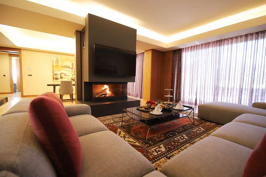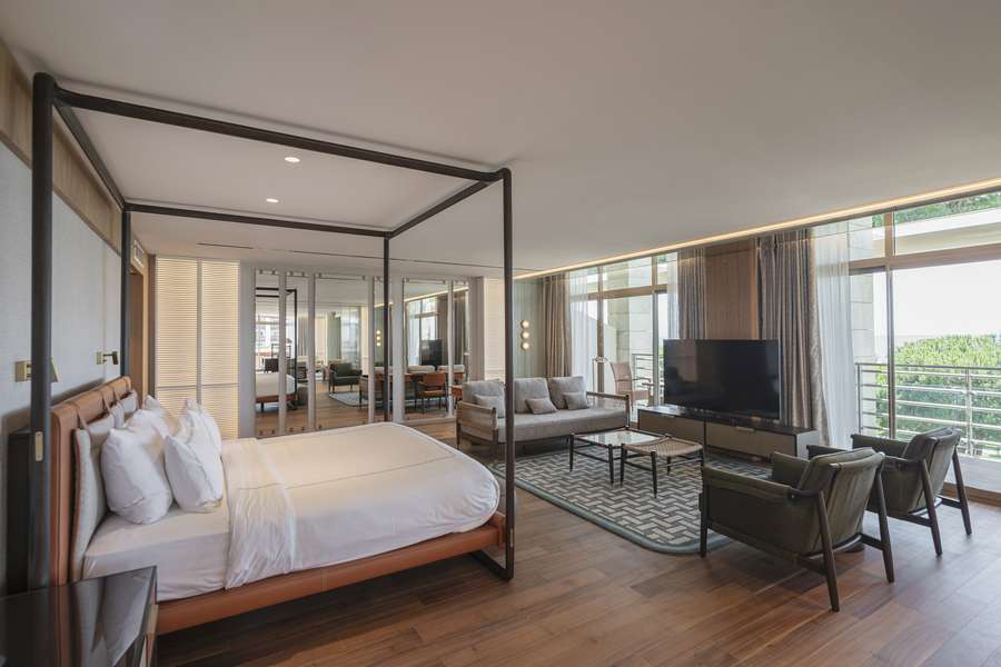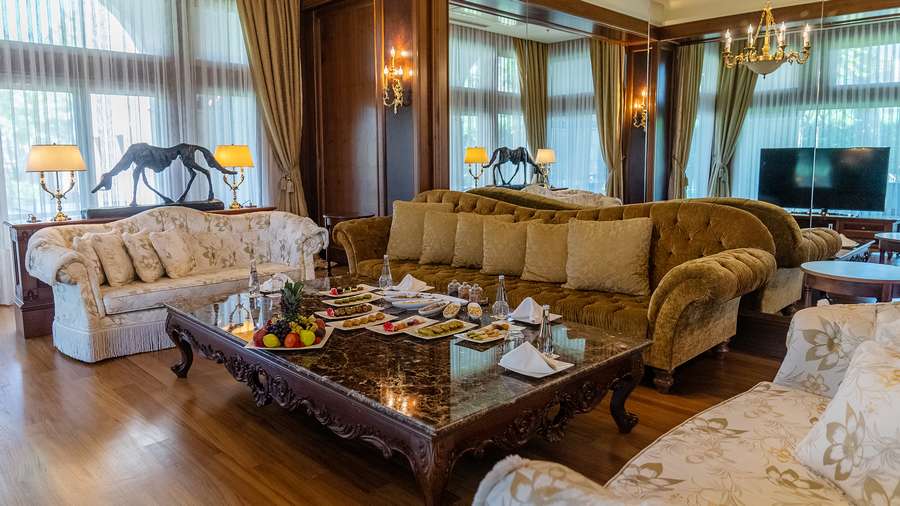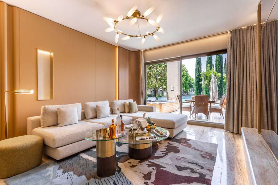 PRESIDENTIAL VILLA - 1200 кв. м. Вид на бассейн и гольф-поля, дуплекс, 6 спален (2 двуспальные, 1 двуспальная «кинг сайз» и 6 односпальных кроватей), 2 спальни для персонала, хамам, сауна, комната для занятий спортом, комната для Спа-процедур и массажа, игровая комната, кинотеатр, гостиная, кухня, 9 туалетов, 6 ванных комнат с джакузи и душем, частный открытый бассейн, терраса и балкон.