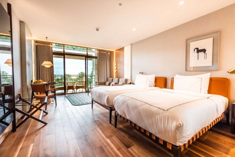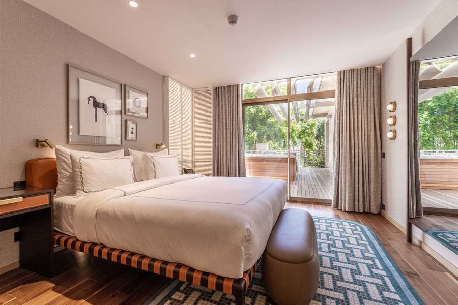 SPA VILLA - 140 кв. м. Вид на бассейн и гольф-поля, дуплекс, 1 спальня с кроватью «кинг сайз», 2 туалета, 2 душа и 2 джакузи (на верхнем этаже и на нижнем этаже), сауна, хамам, гостиная, терраса и общий открытый бассейн.