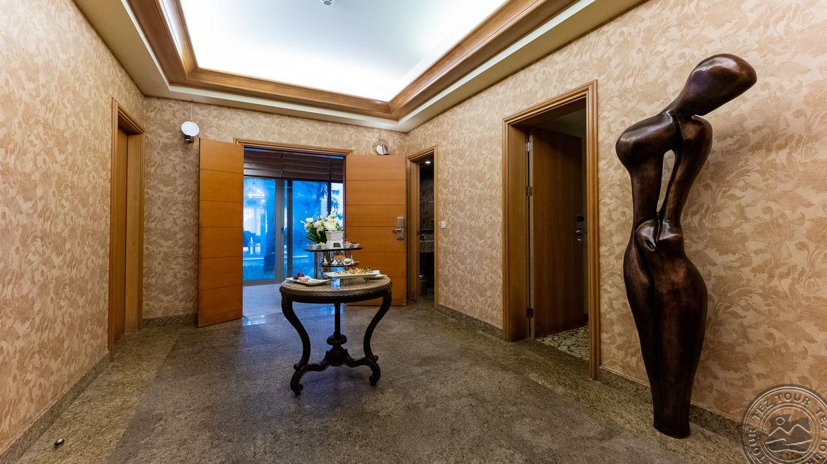 1 двухуровневая Presidential Villa (на первом уровне: собственный бассейн, гостиная, сауна, джакузи, велотренажер и беговая дорожка, кухня, посудомоечная машина, рабочий кабинет, 3 спальни с дверью, 3 ванных комнаты с душем; на втором уровне: 3 спальни с дверью, 3 ванных комнаты (одна с джакузи и душем, две другие с ванными), макс. 10+1 чел., 700 м2, VIP-сервис).
