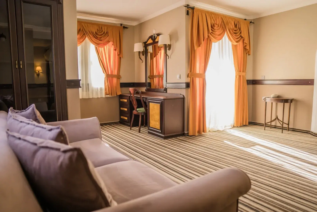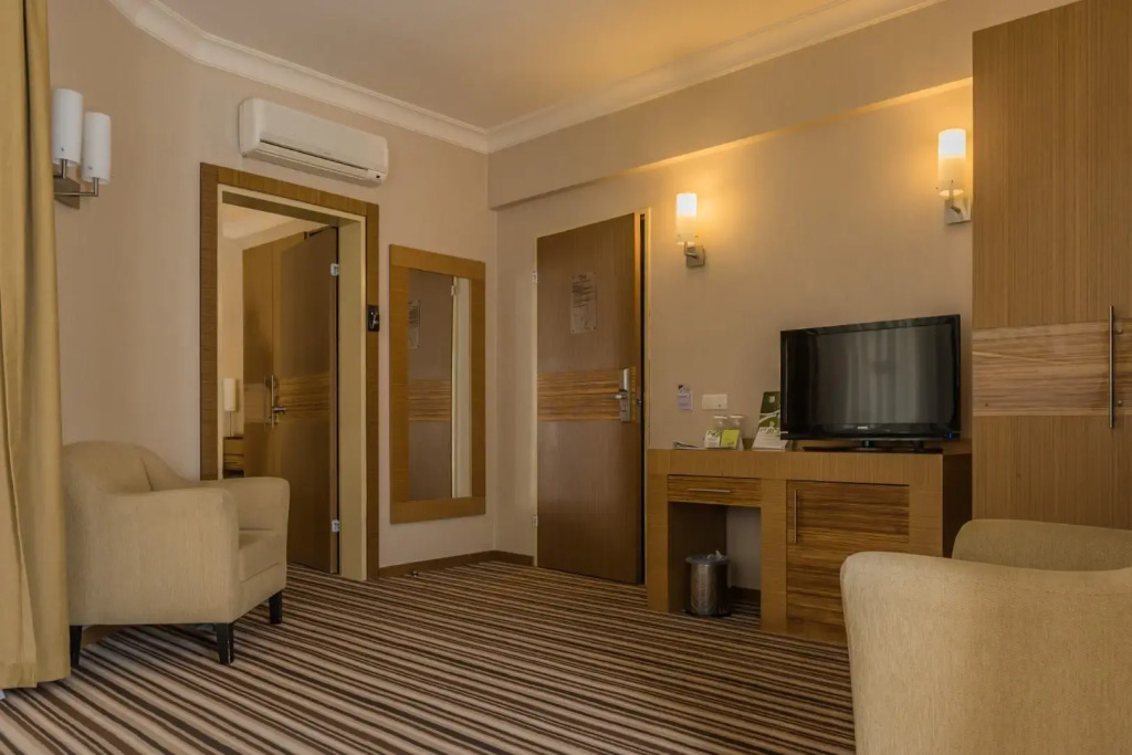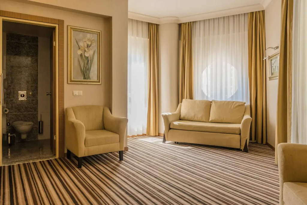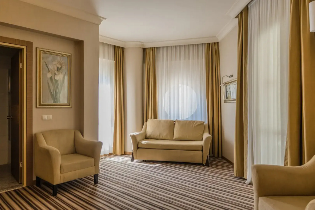 Описание номеров Grand Cettia Hotel 5*:В отеле Grand Cettia 244 номеров. Во всех номерах предусмотрены балконы. Красочно декорированные номера отеля имеют бесплатный Wi-Fi и уголок с диваном.; В каждом номере имеется телевизор, телефон с прямым набором номера и сейф. В ванных комнатах установлен ручной душ, телефон, зеркало и фен.; Обслуживание номеров по расписанию.