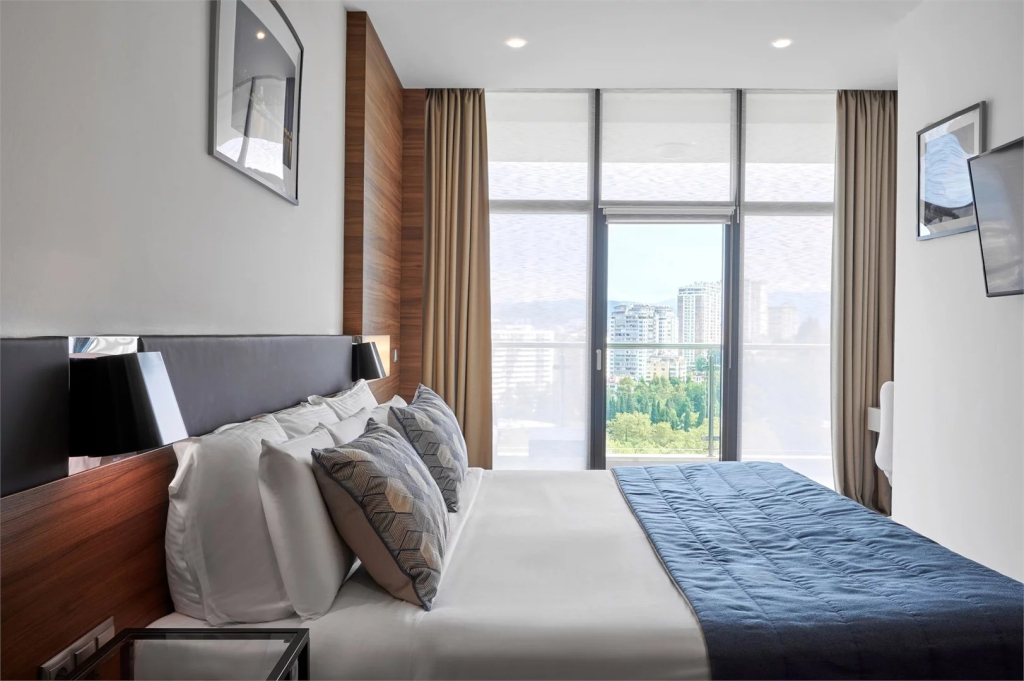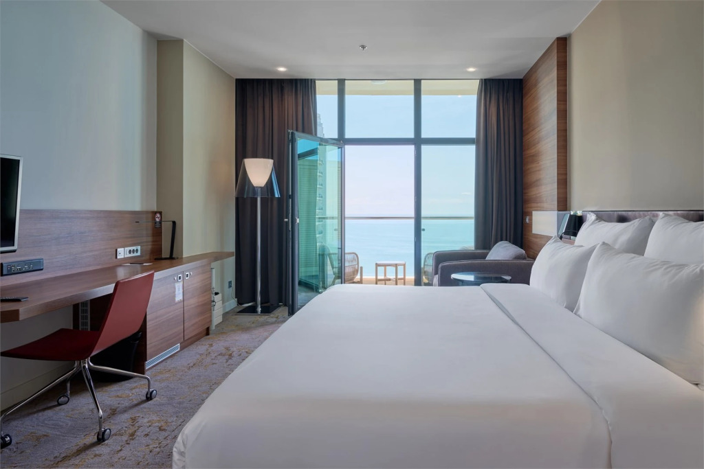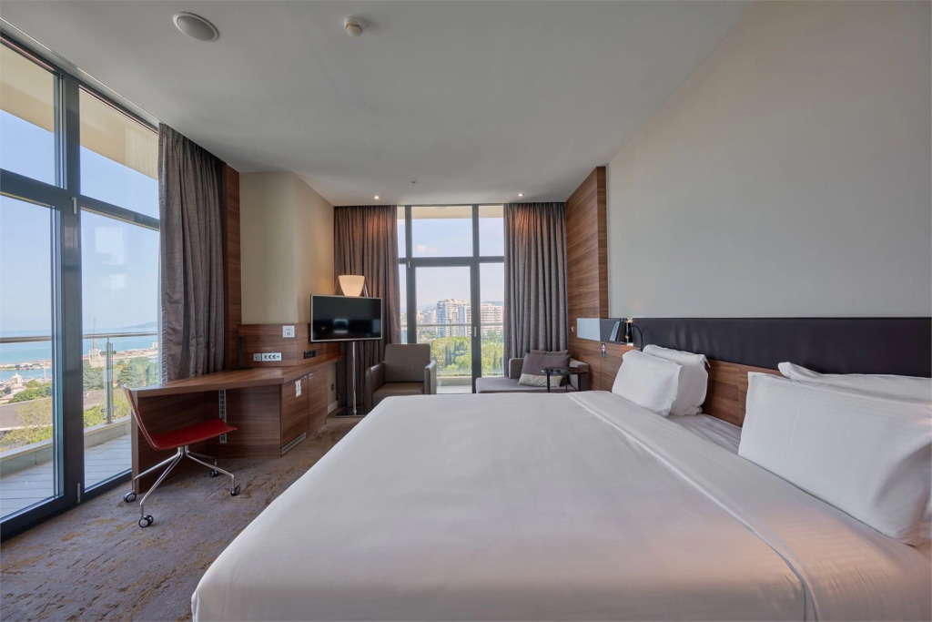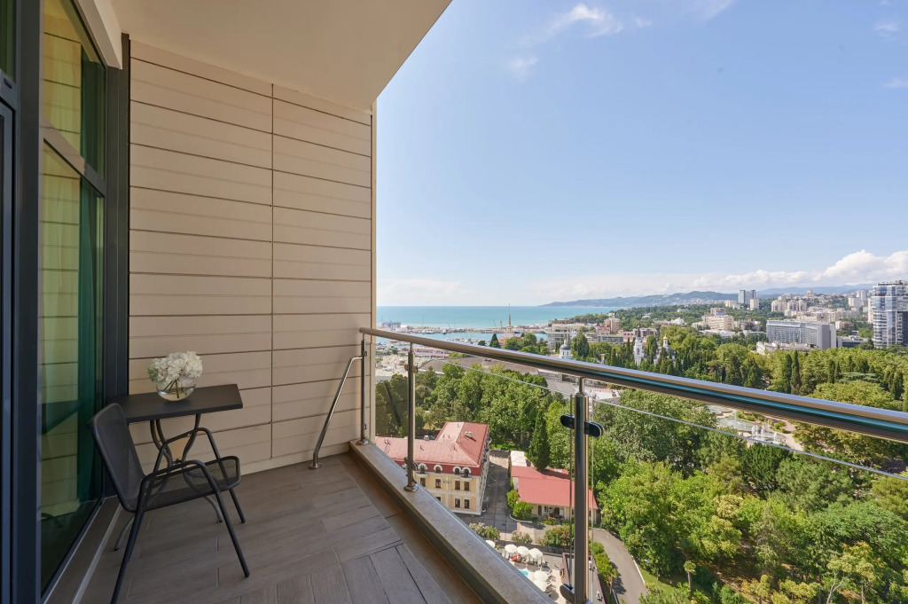 Описание номеров Grand Karat Sochi 5*:Отель «Pullman Sochi Centre» предлагает гостям 151 номер различных категорий, с панорамой Чёрного моря из каждого номера.; Лаундж зона Sea View Lounge — комплимент от отеля для гостей, проживающих в номерах категорий «Представительский» и во всех видах люксов. В лаундж зоне с террасой с видом на море круглосуточно сервируются б/а и алкогольные напитки, свежие фрукты, печенье, горячие закуски.