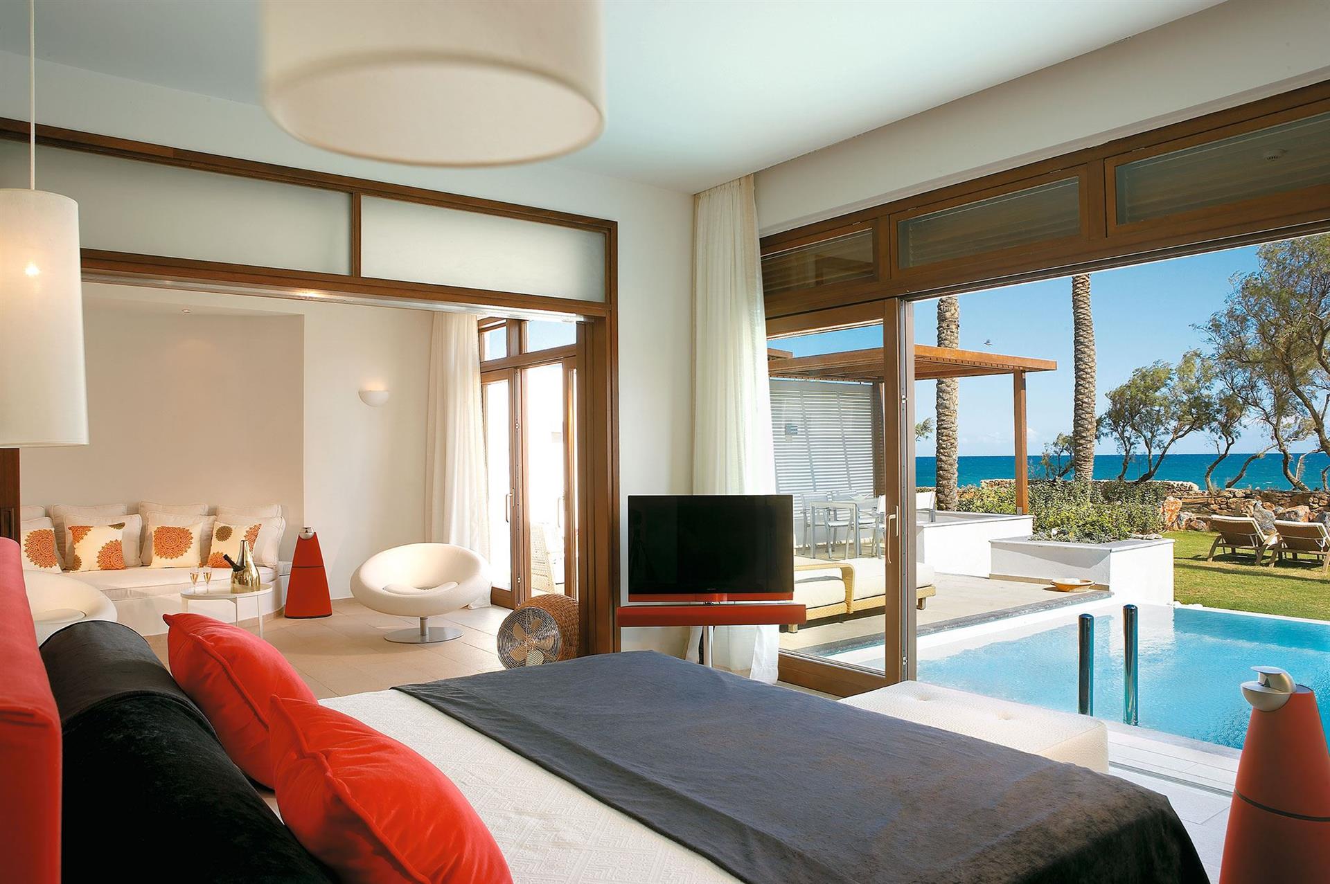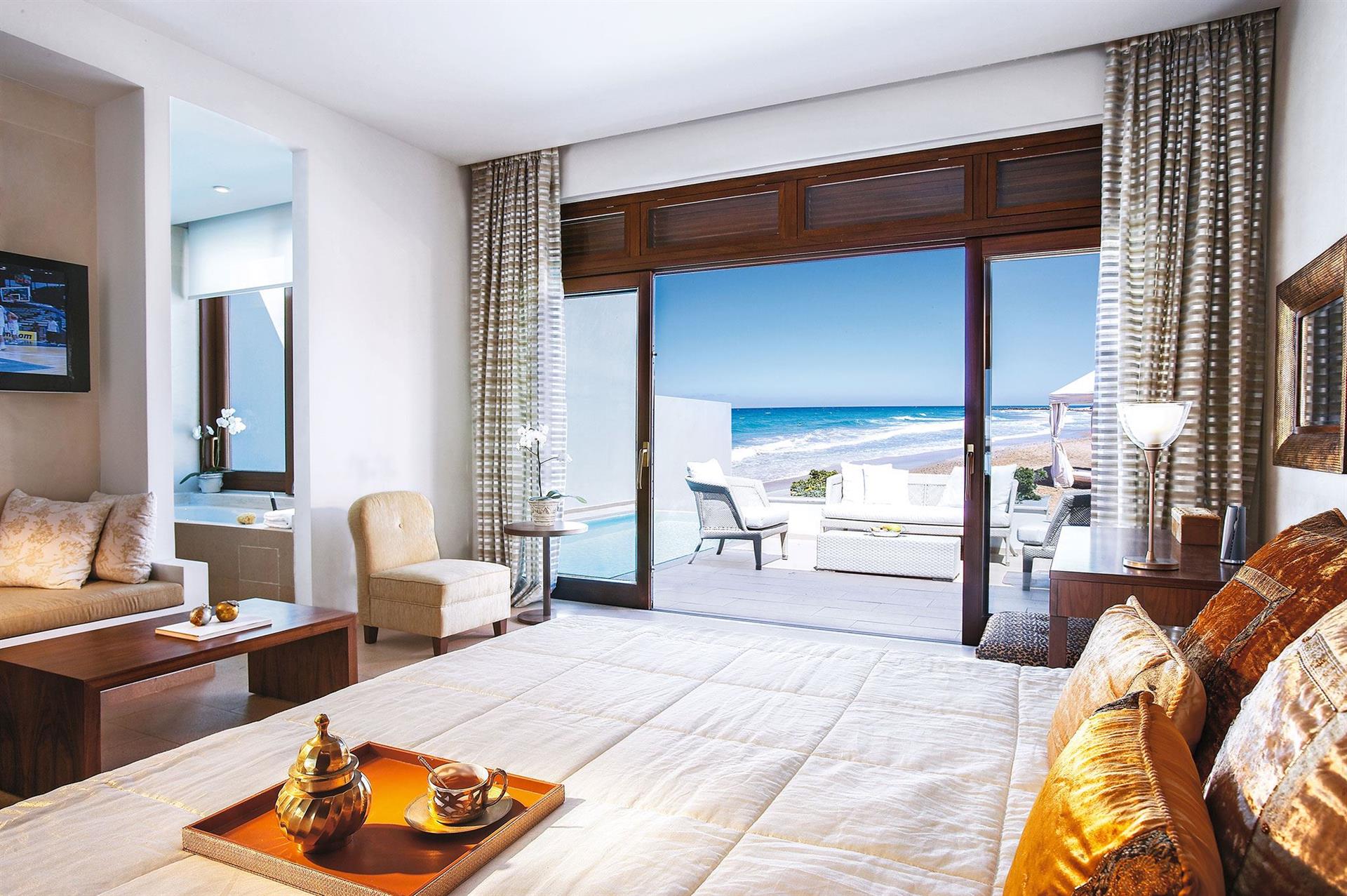 • Amirandes Vip 2 Bedroom Suite Gym & Private Pool with Garden View (вид на сад или на море, крыло Lagoon, первый этаж, 2 линия; 2 спальни – одна из них с гостиной зоной, двуспальная кровать, доп. – 2 кровати, отдельная зона для фитнеса, терраса (50 м2), индивидуальный бассейн с подогревом (18 м2), макс. 4+1 чел., 85 м2)
