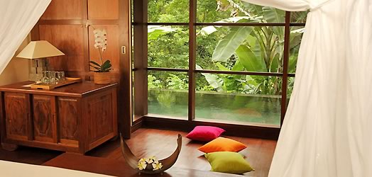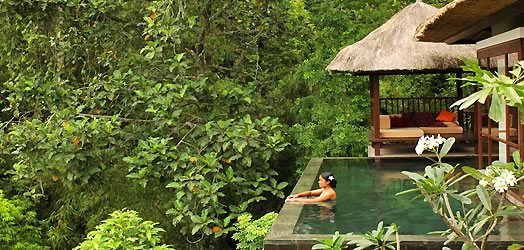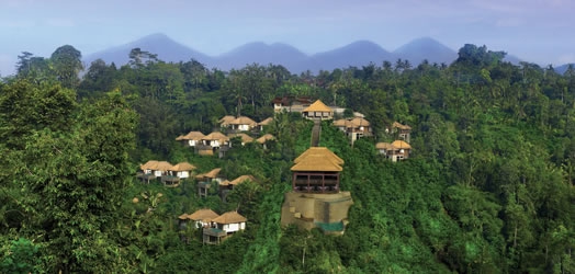 Отель разместился на рисовых террасах Убуд, тянущихся по крутым склонам холма. С этих мест открывается великолепный панорамный вид на живописные окрестности долины реки Аюнг. Виллы класса "люкс", выстроена в традиционном балийском стиле.