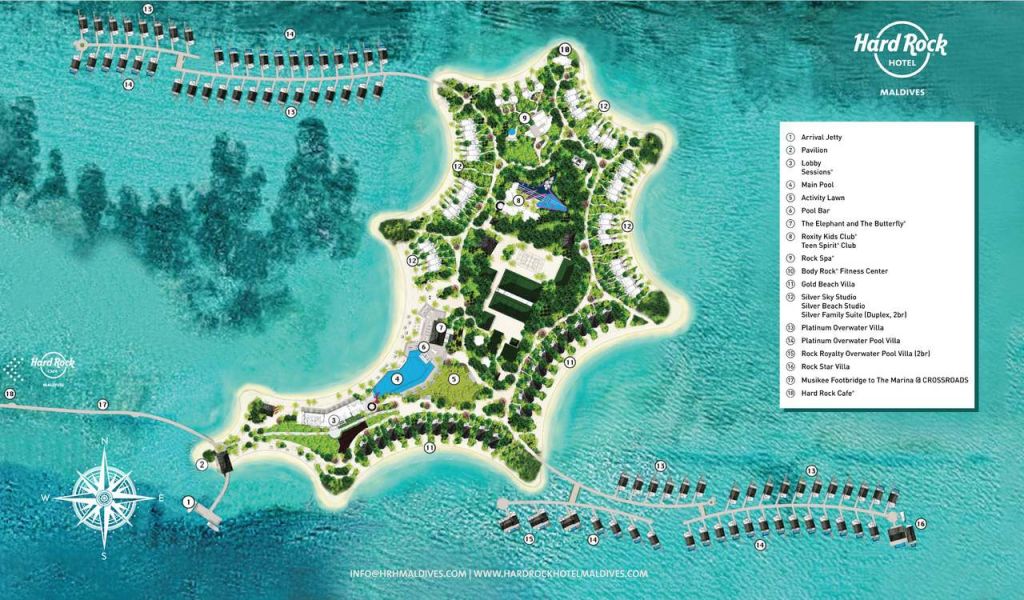 Hard Rock Hotel Maldives 5*– является частью первого интегрированного курорта на Мальдивах CROSSROADS, объединяющего два острова-отеля (Hard Rock Maldives и Saii Lagoon) и остров развлечений Marina с ресторанами, барами, магазинами, пляжным клубом и причалом для яхт. В Hard Rock Hotel Maldives есть всё для классного, веселого и беззаботного отдыха семей, пар, компании друзей или коллег: от различных наземных и водных видов спорта и роскошного спа-центра до развлекательных мероприятий для детей и взрослых, включая музыкальную программу The Sound of Stay, предлагающую бесплатное использование гитар Fender и проигрывателей Crosely.