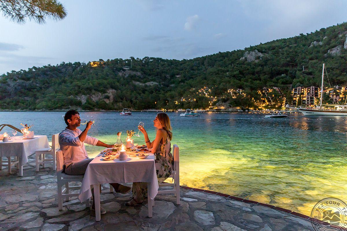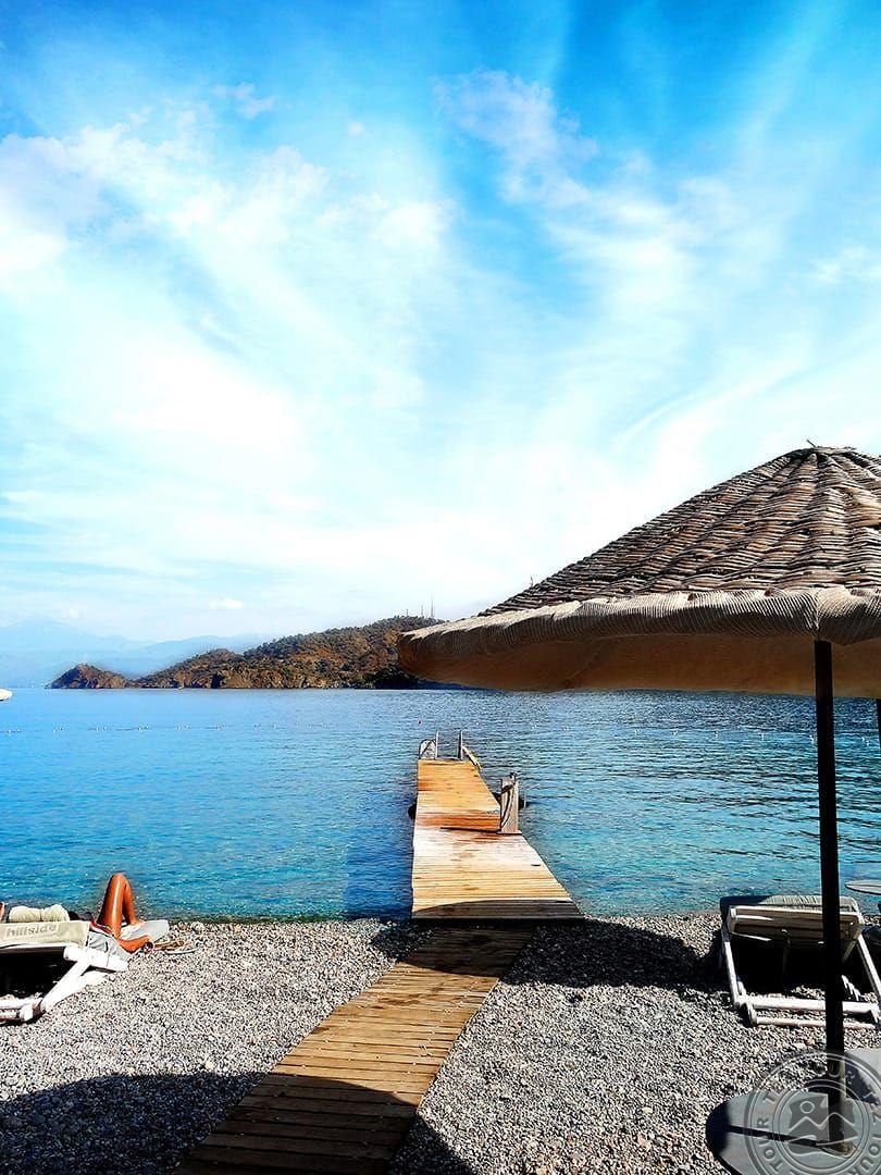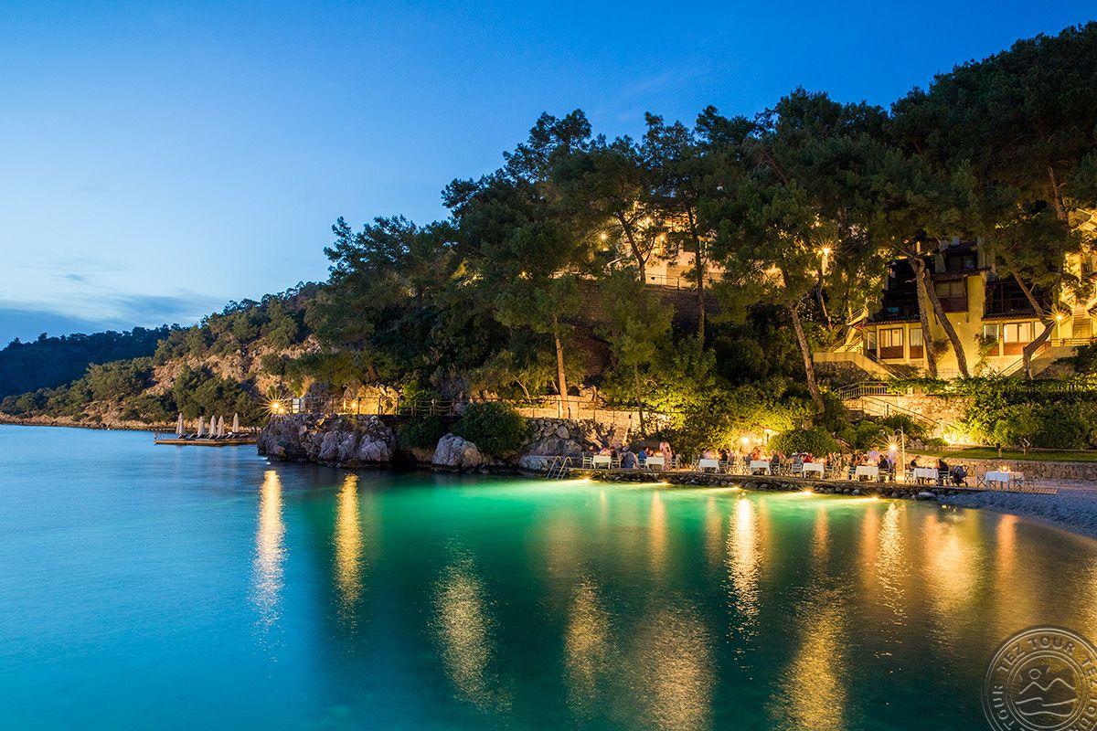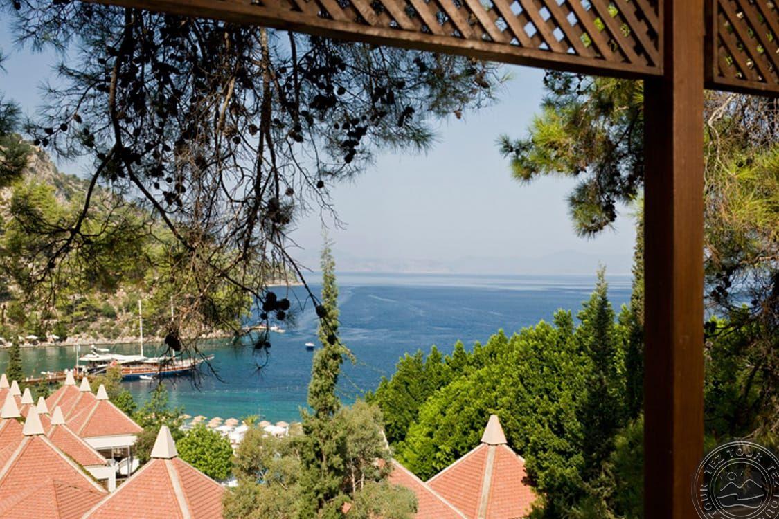 в 55 км от аэропорта г. Даламан, в 210 км от аэропорта Милас Бодрума, в 4 км от г. Фетхие, на берегу моря.
