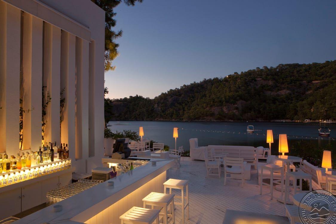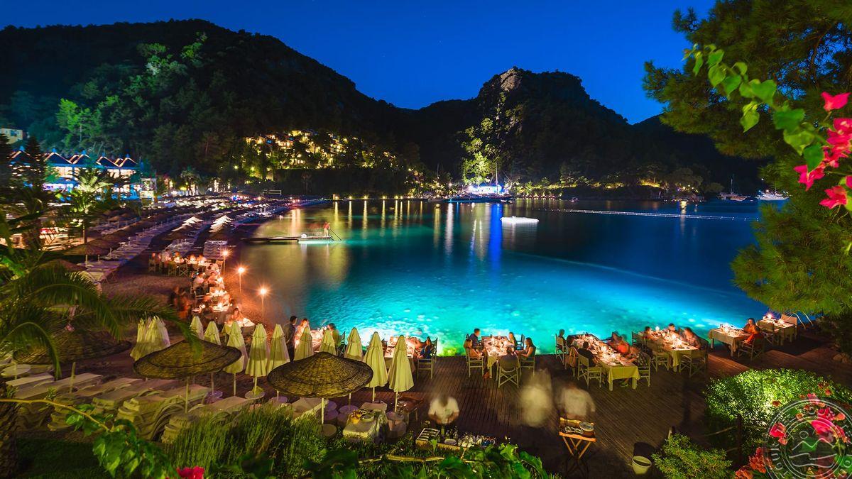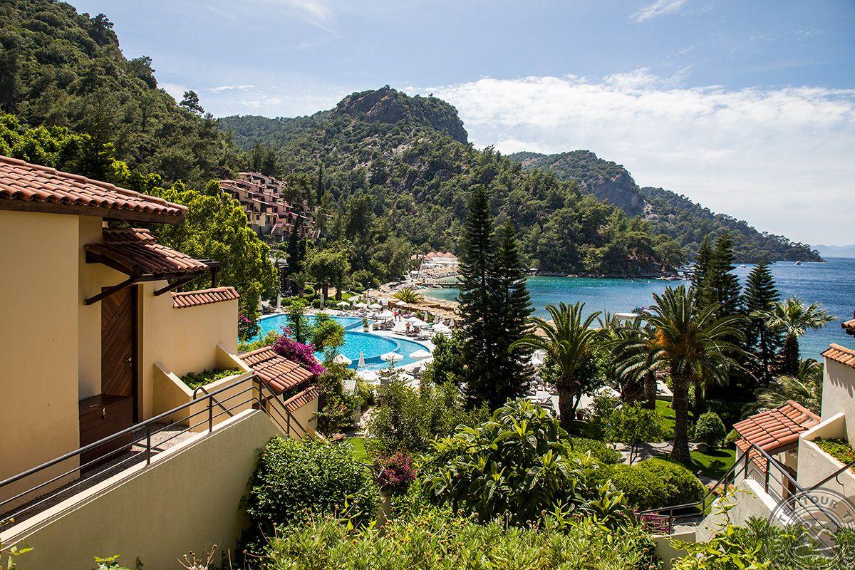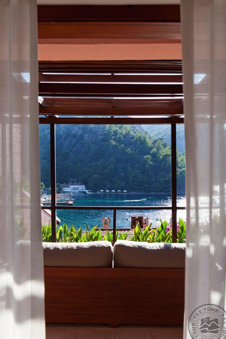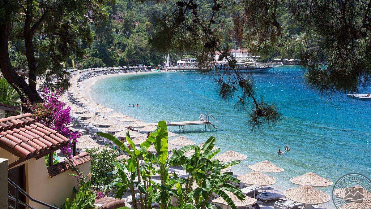 в 55 км от аэропорта г. Даламан, в 210 км от аэропорта Милас Бодрума, в 4 км от г. Фетхие, на берегу моря.