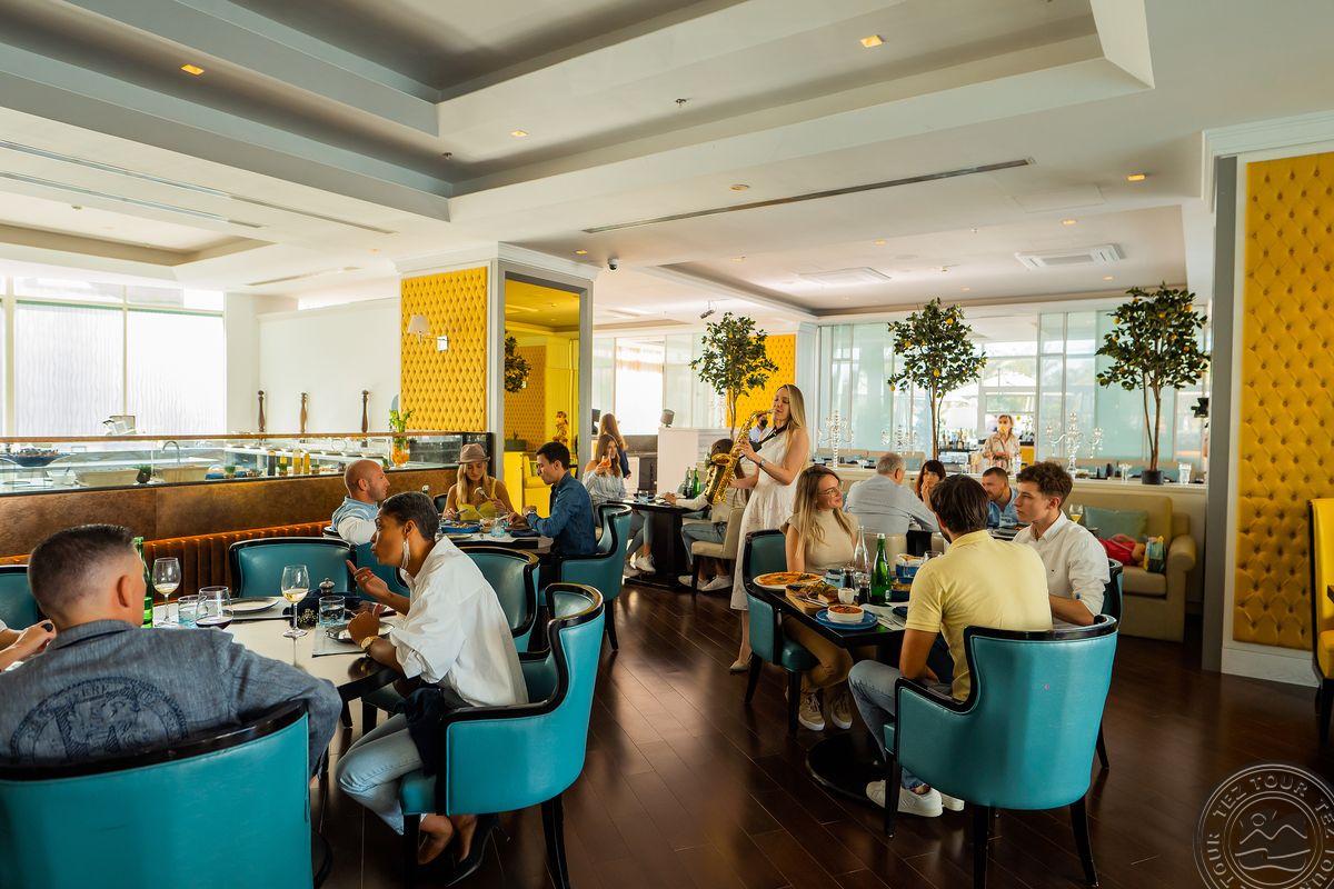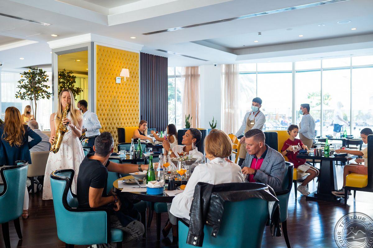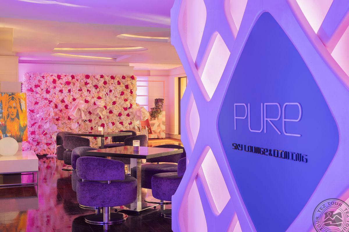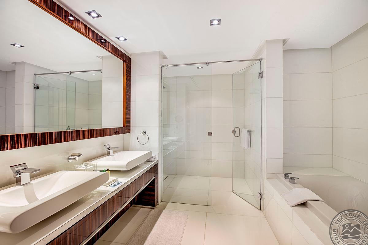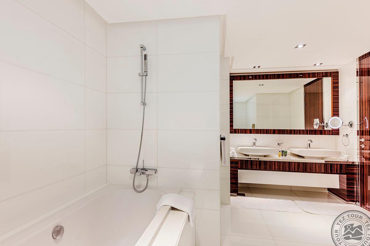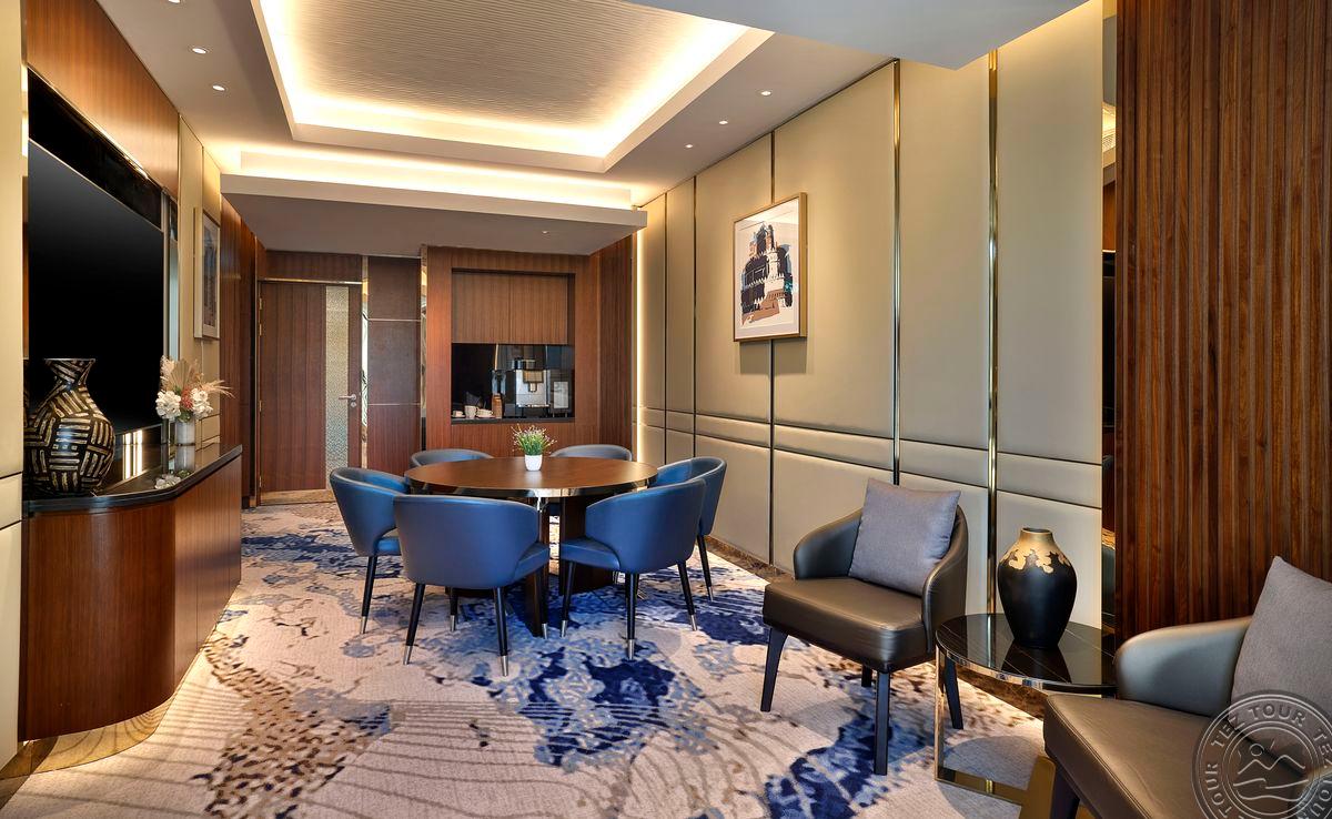 Junior Suite Sea View = Junior Suite Sea View with Balcony (выше 17 этажа, с видом на море, спальня и гостиная зона + кухня с барной стойкой (стиральная машина, микроволновая печь, холодильник,), кровать king-size, балкон, макс. 3 или 2+2 чел., 60 м2, клубные привилегии, доступ в Executive Club Lounge);