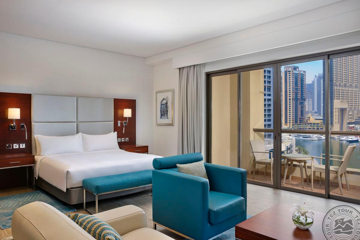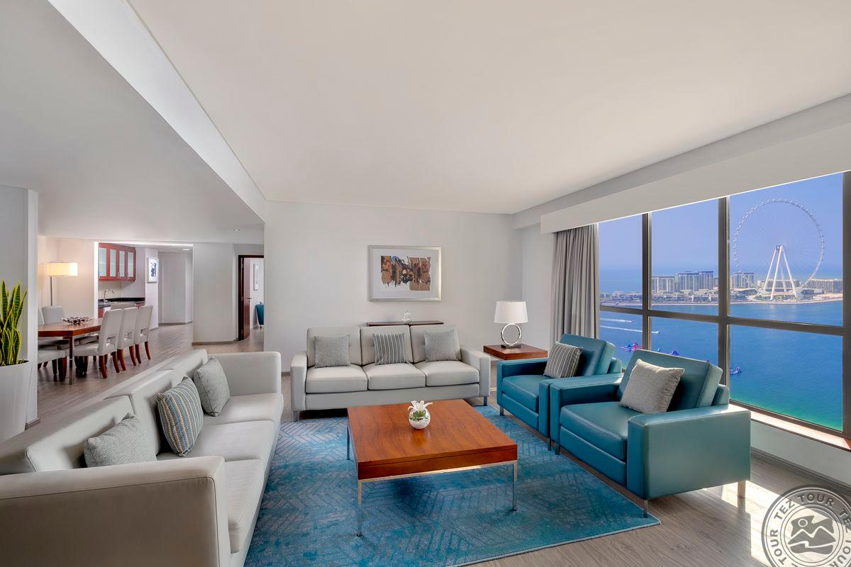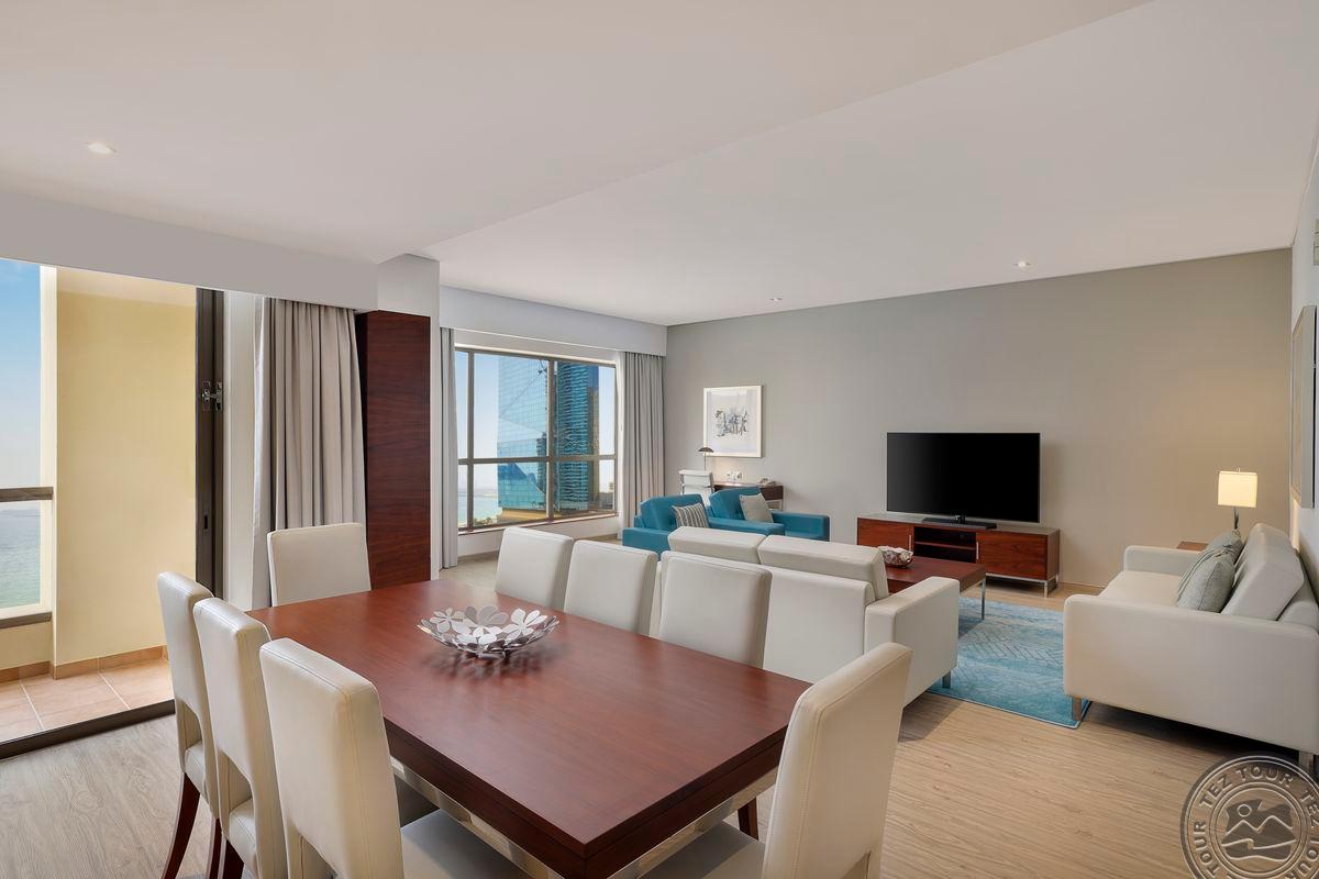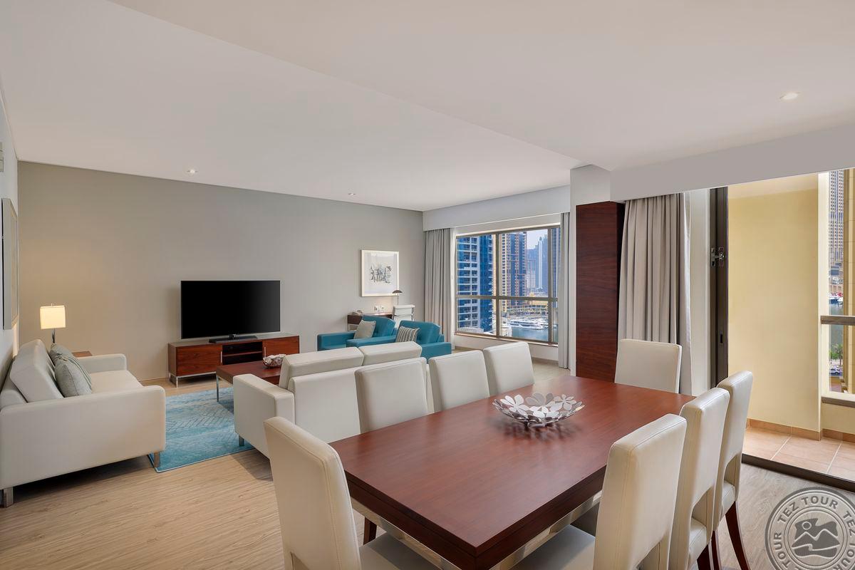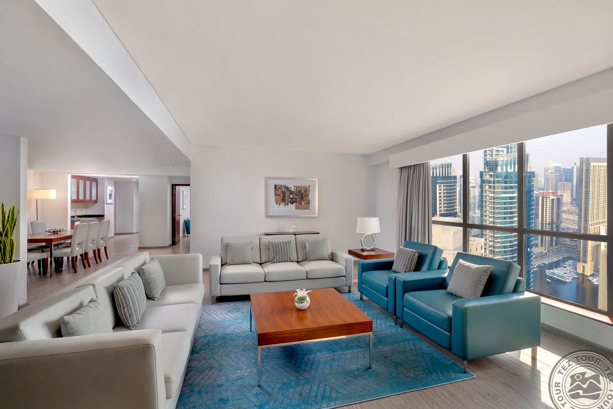 Junior Suite Courtyard View = Junior Suite with Balcony (выше 17 этажа, с видом на Дубай-Марину, спальня и гостиная зона + кухня с барной стойкой (стиральная машина, микроволновая печь, холодильник, кровать king-size, балкон, макс. 3 или 2+2 чел., 60 м2, клубные привилегии, доступ в Executive Club Lounge);