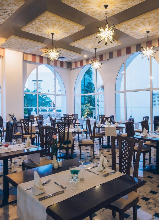 Рестораны, кафе и бары:- основной ресторан (шведский стол, итальянская кухня)- рестораны a la carte (платно): восточная кухня, тунисская кухня- бар у бассейна- бар с террасой- бар на пляже- лобби-бар- бар-салон, главный ресторан ((итальянский ресторан, шведский стол)), a la carte рестораны (2 шт), бары (5 шт, (включая бар на пляже и у бассейна))