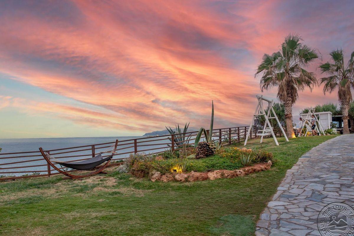 в заливе Малия, в 33 км от аэропорта г. Ираклион, в 500 м от курортного городка Сталида, в 1 км от Малии, на берегу моря.